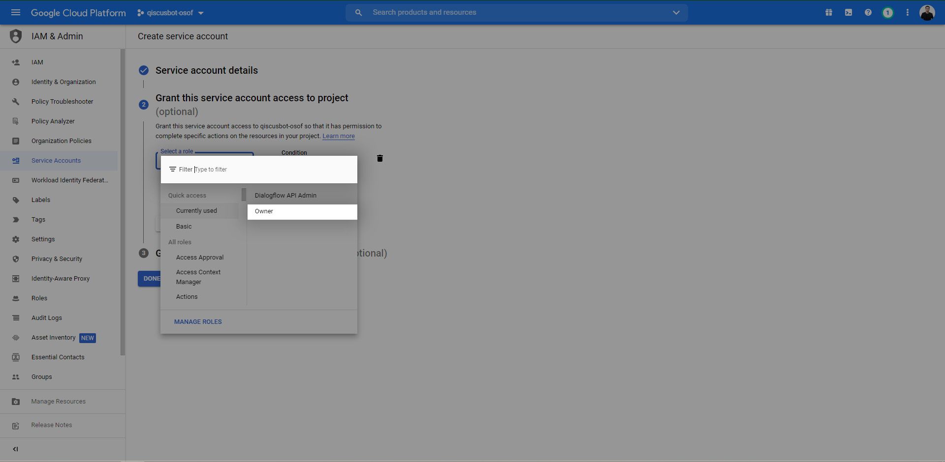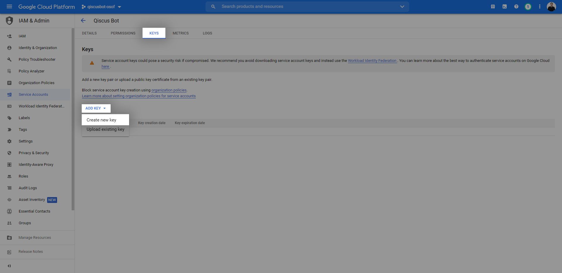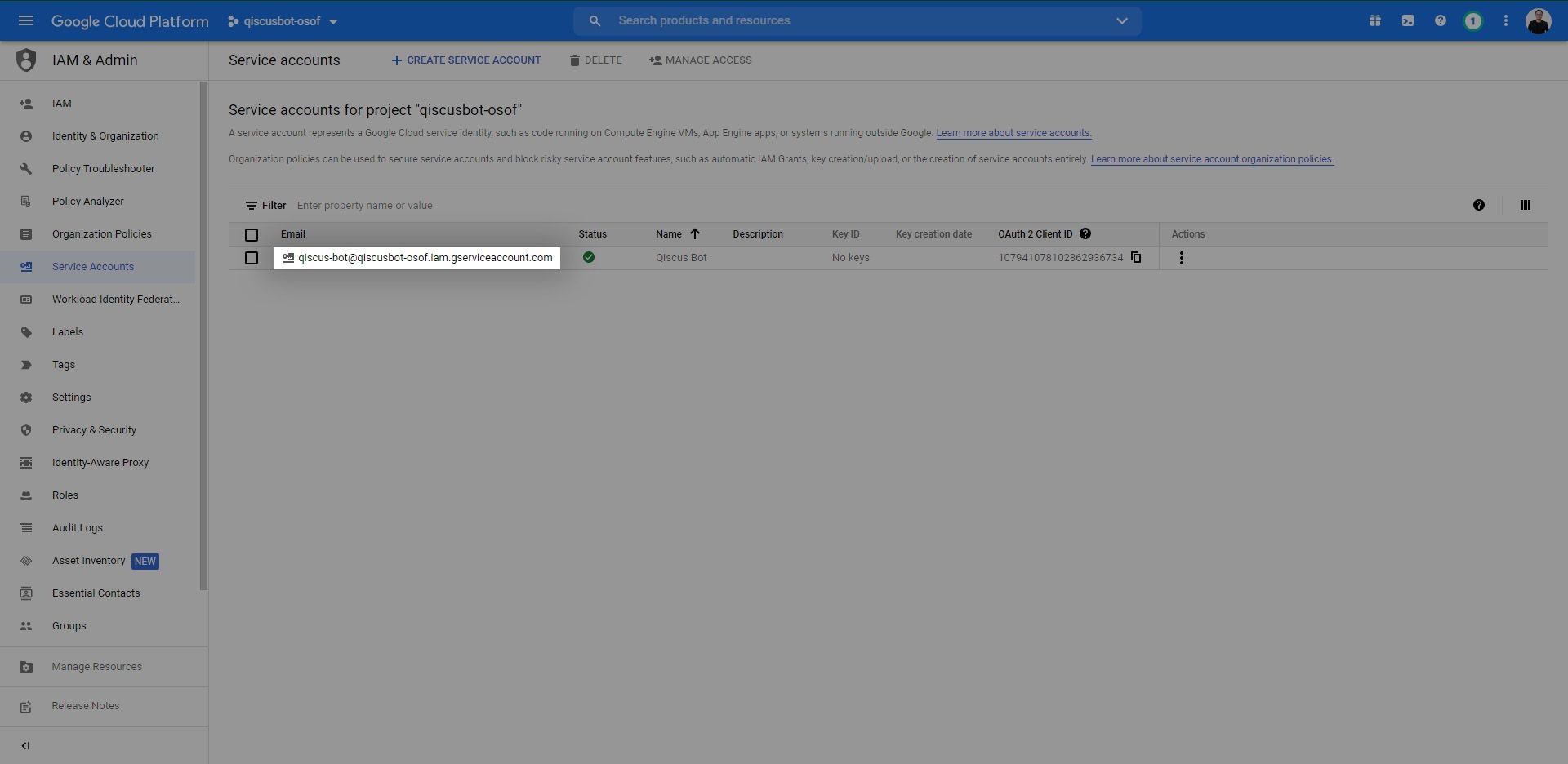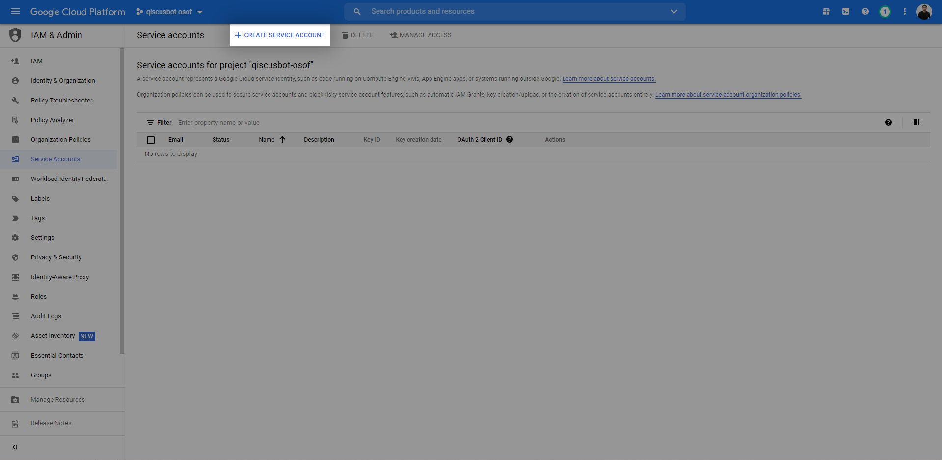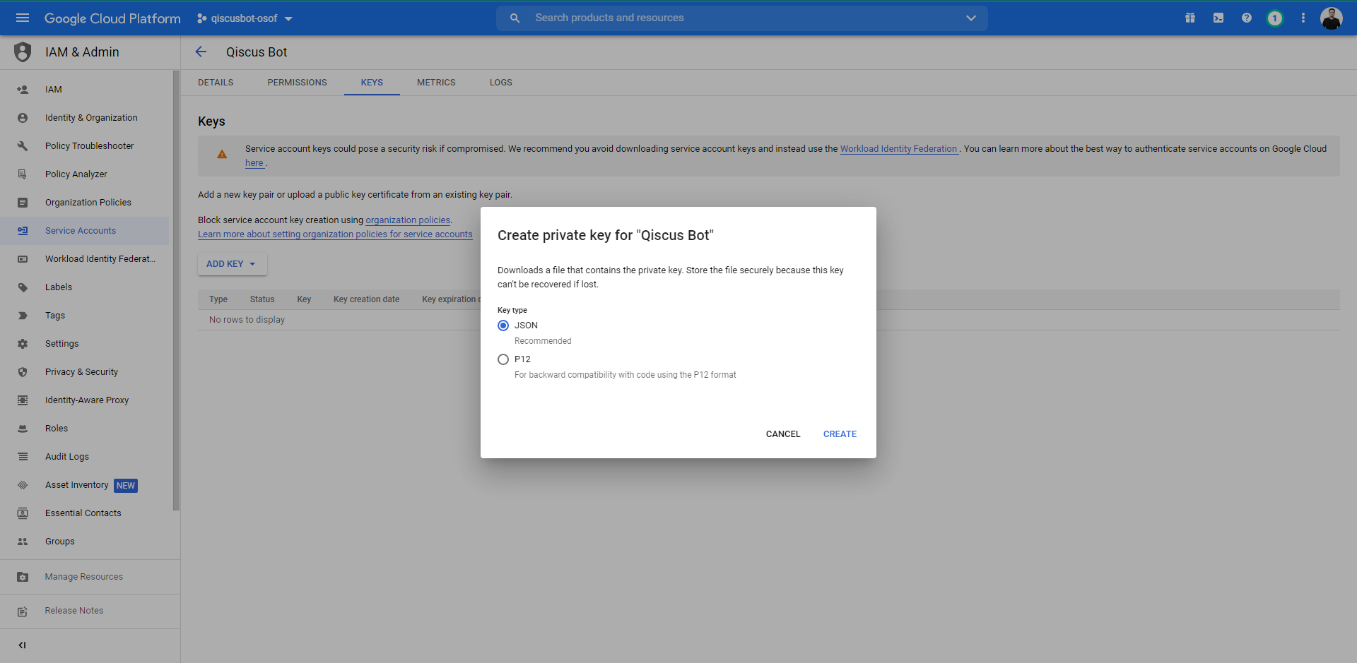 - In this step, the service account has been created in the qiscusbot-osof project. The next step is to download the JSON file in the project