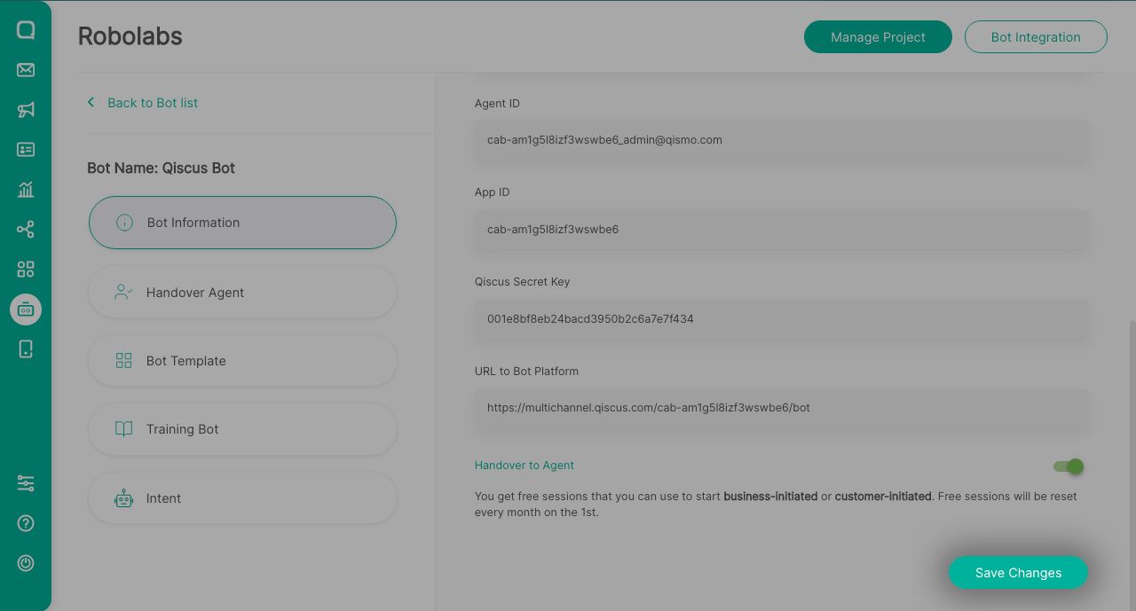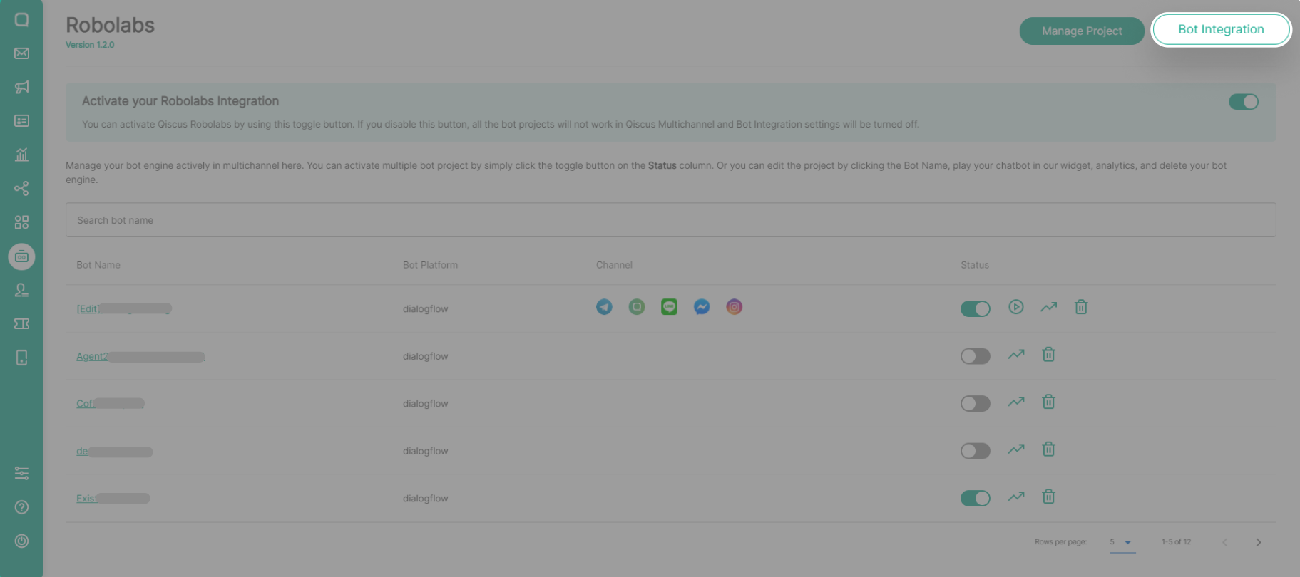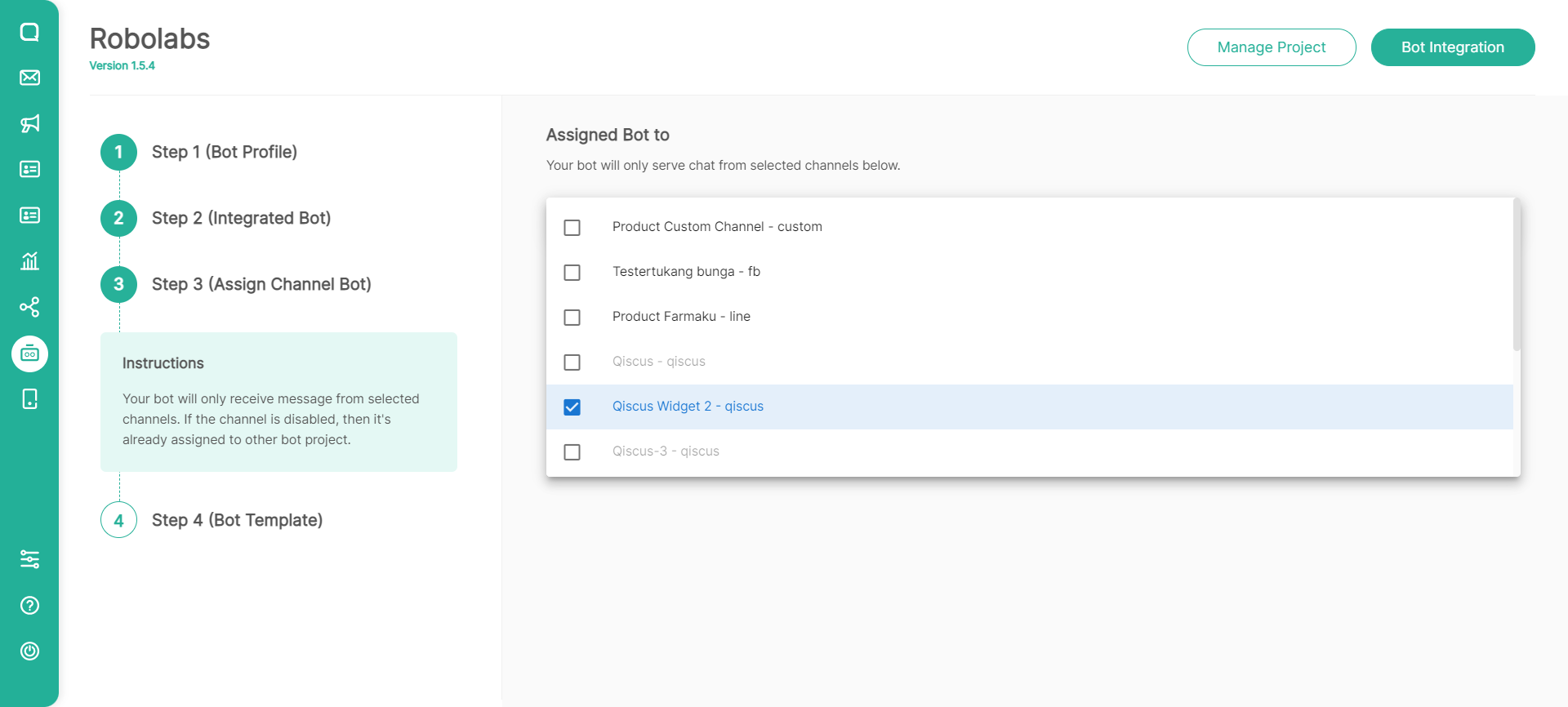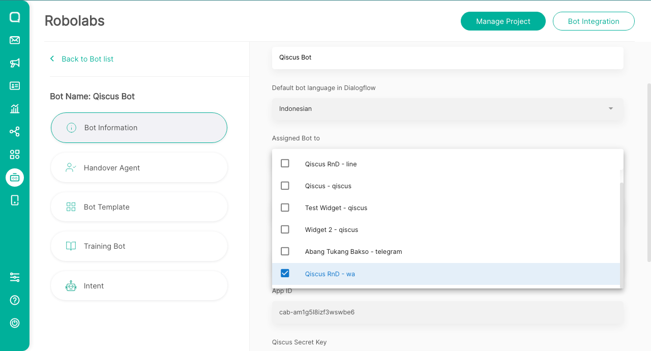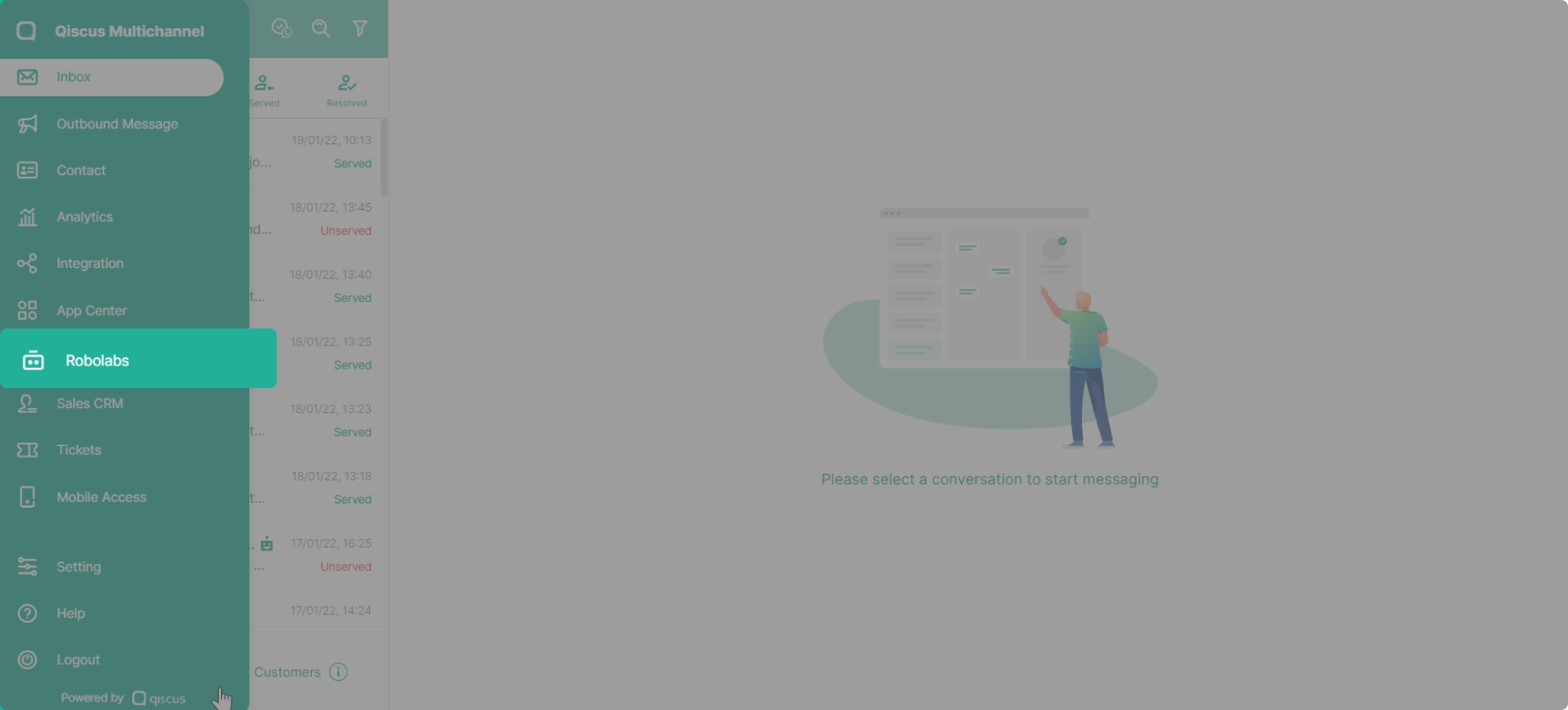 - Go to Robolabs on the sidebar in Qiscus Omnichannel Chat.