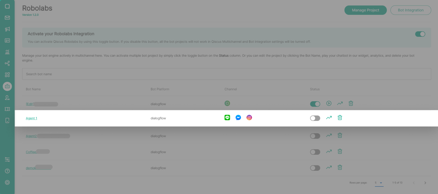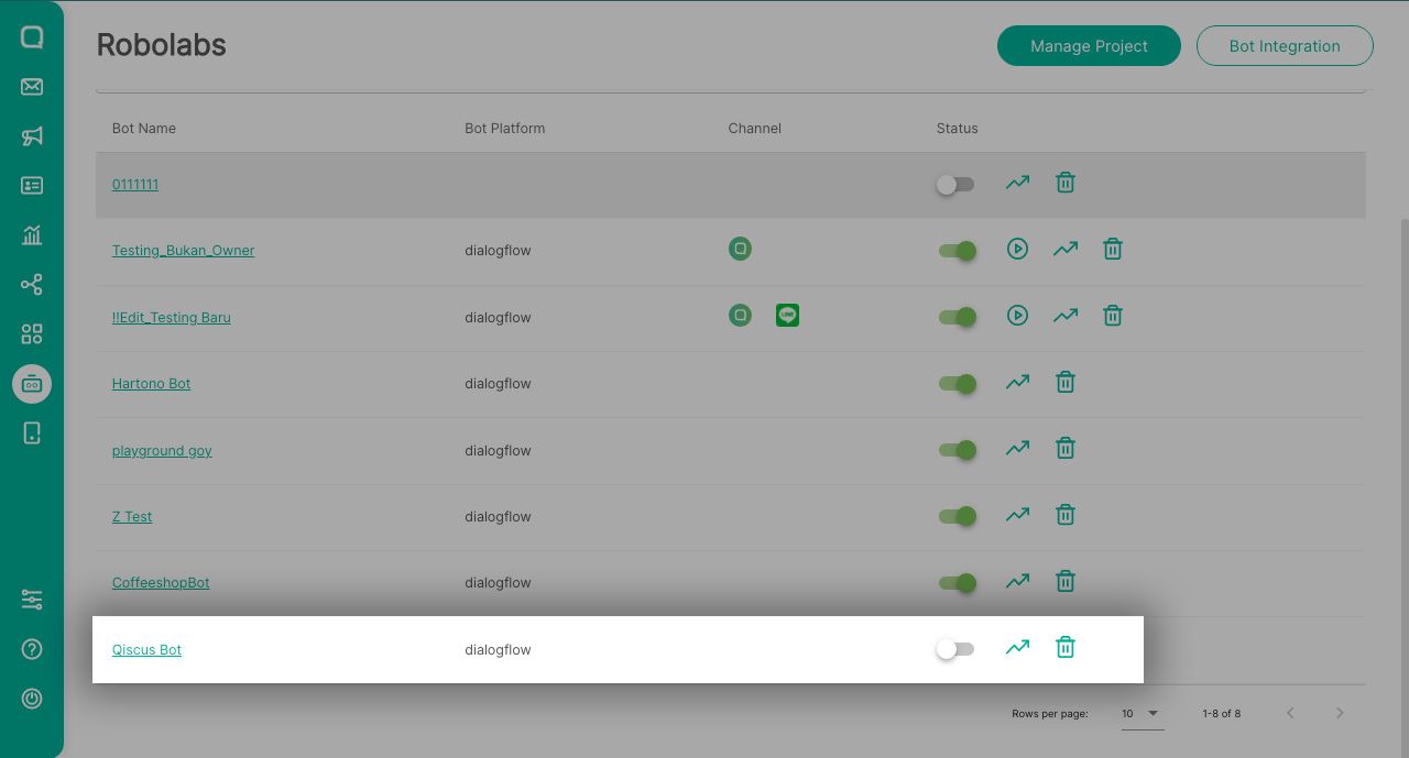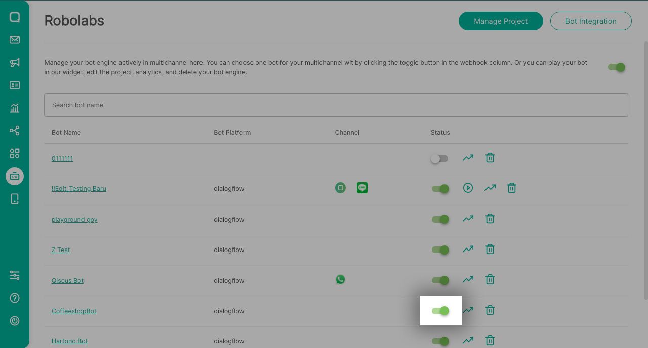 After that, return to the Manage Project page to activate the project bot by activating the toggle located next to the bot name in the Status column.