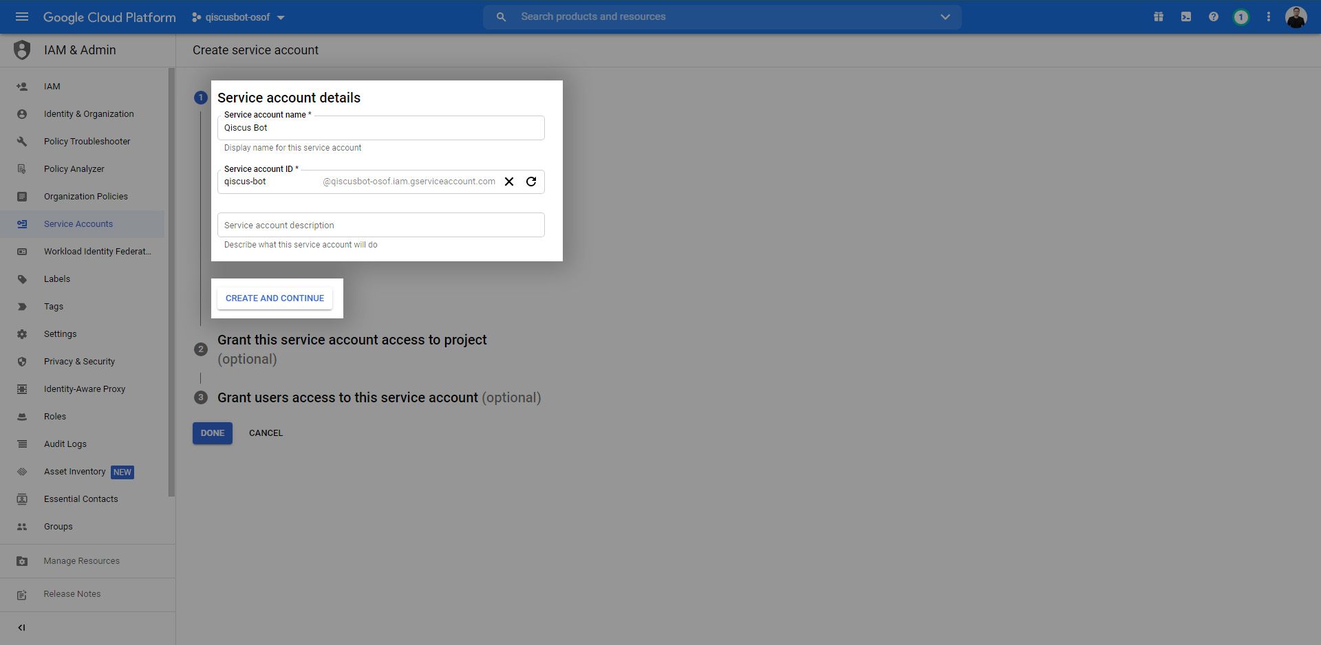 - After entering the Create Service Account page, enter the Service Account Name according to the project name. Here is an example: we enter the name Qiscus Bot. Then, click CREATE AND CONTINUE
