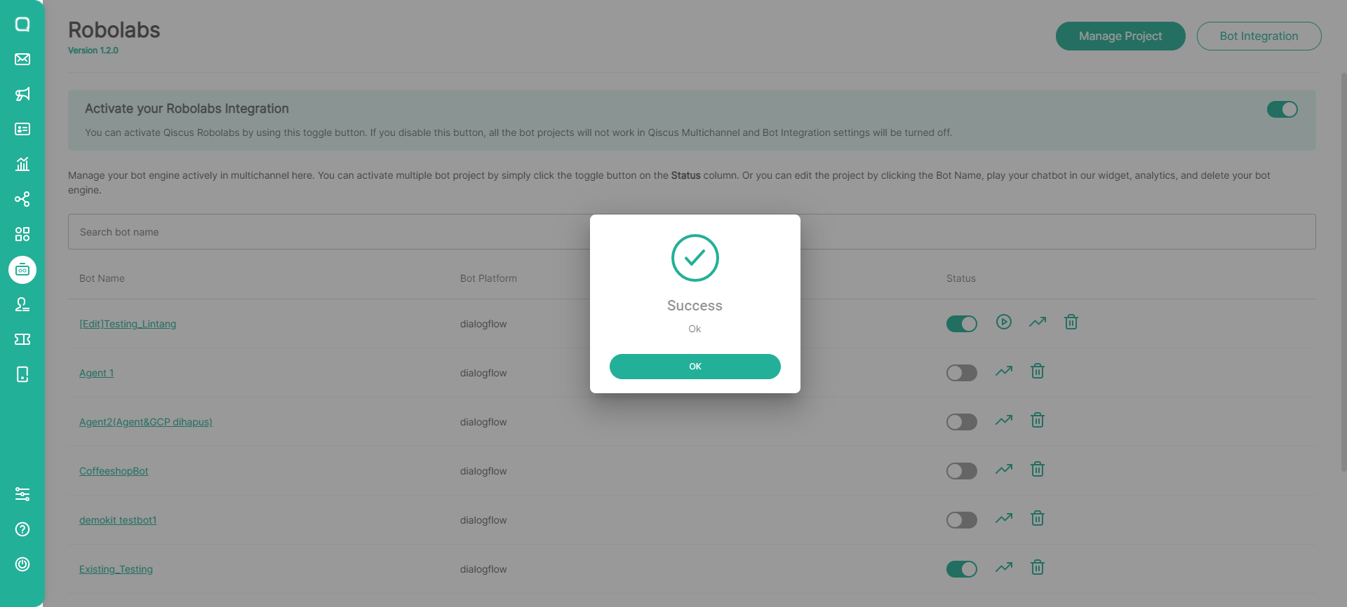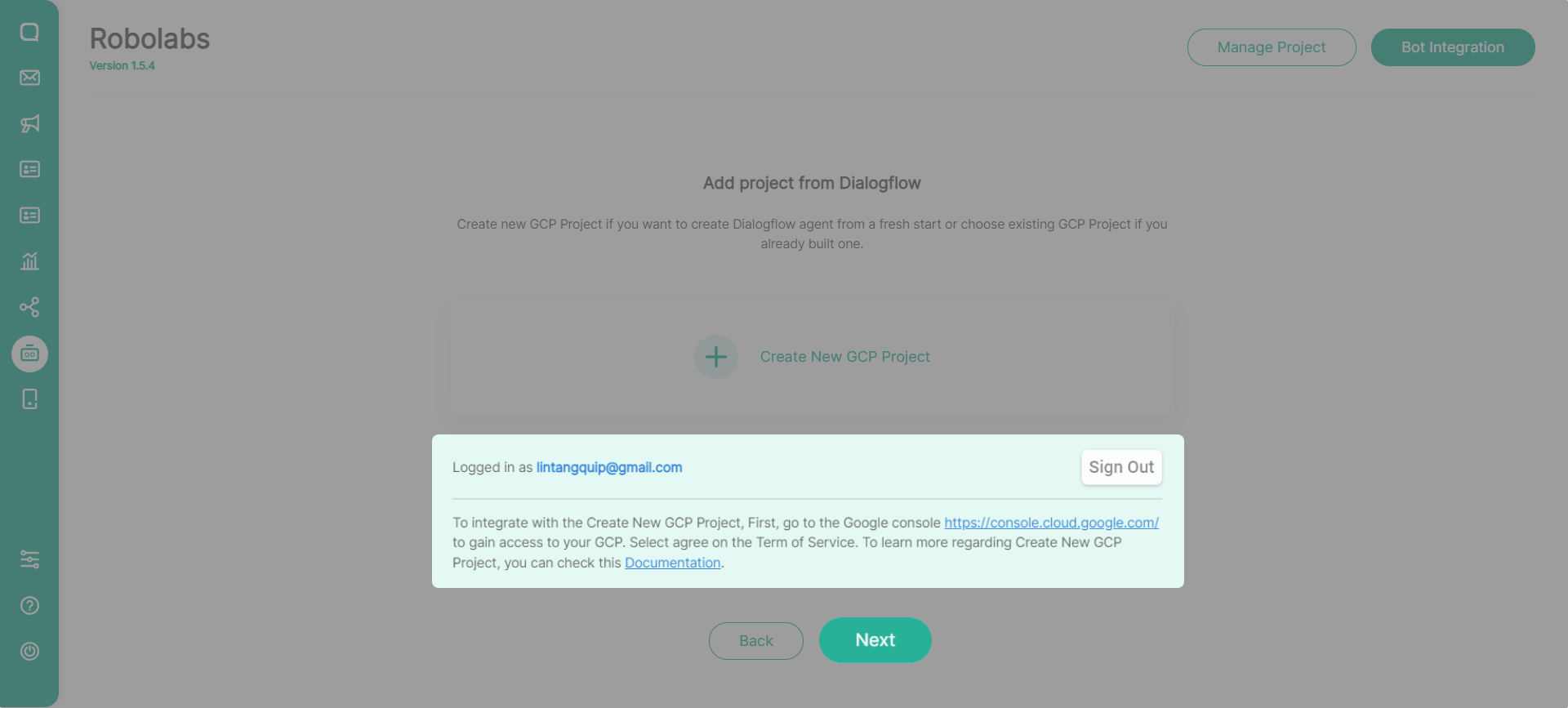 Robolabs is a platform integrator between bot engines and Qiscus Omnichannel Chat. To create a chatbot on Robolabs, it is necessary to integrate it with a bot engine in a Dialogflow project. Previously, users had to manually set up integration, obtain a service account key file in JSON format, and go through complex steps. To simplify this process, Robolabs now provides an easier integration method via Google OAuth.