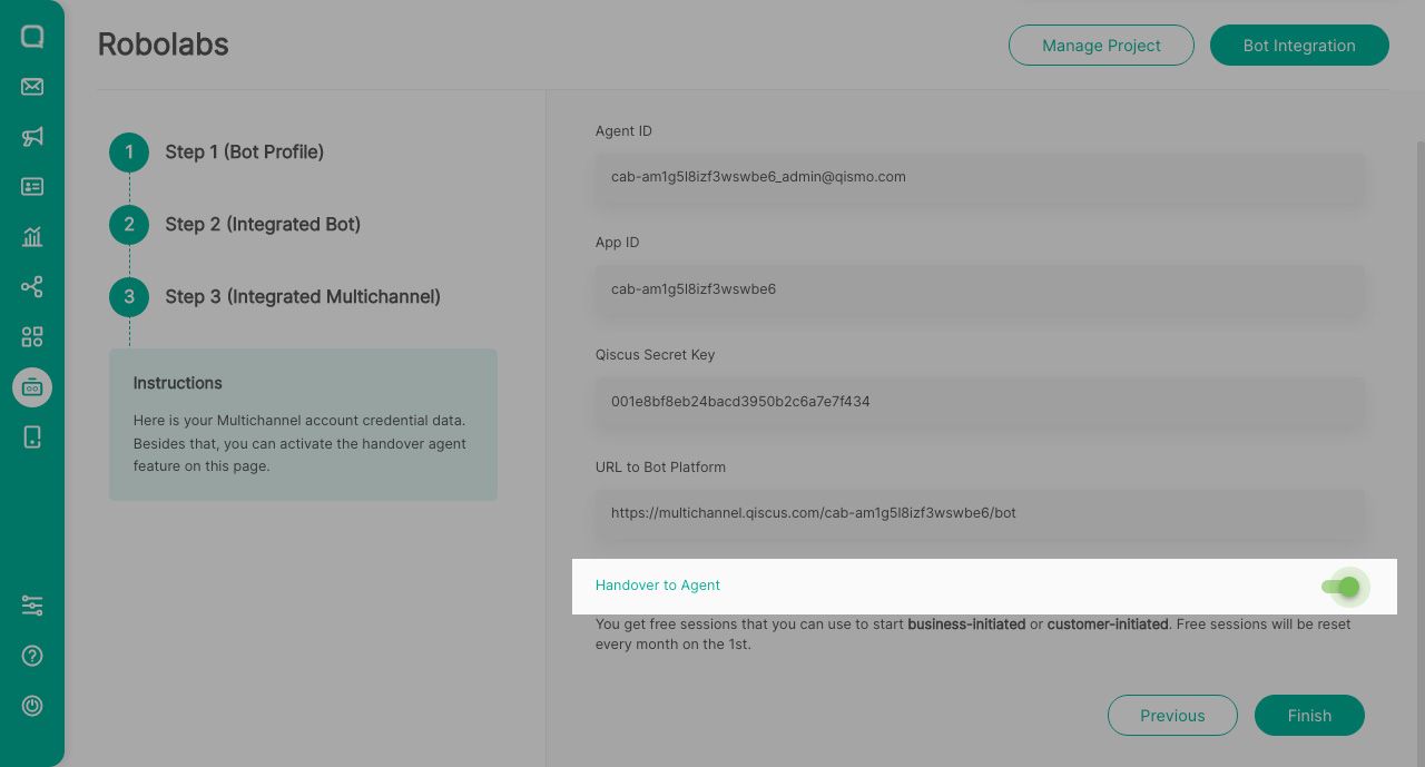 After that, you will return to the third page to Integrate Multichannel. Here, you do not need to change the settings contained in Multichannel because it is automatically integrated. Also, if you want to activate the Handover to Agent feature, you must change the position of the toggle contained in the feature on this page to activate it. Then, click Finish