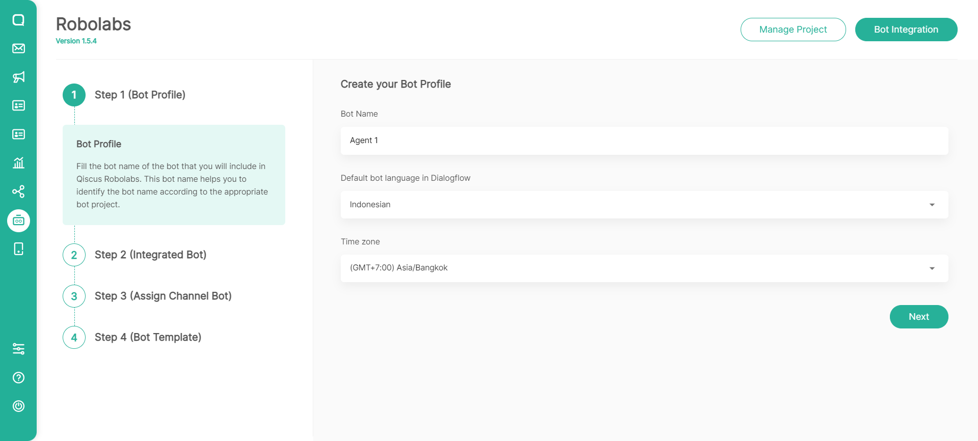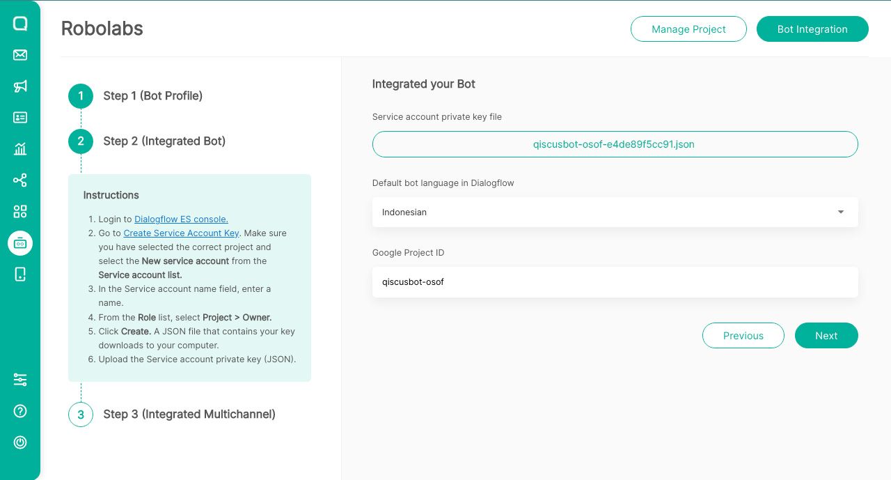 After obtaining the Google Project ID, Default Bot Language, and Service Account Key in Dialogflow, you can return to the Integrate Bot page on Qiscus Robolabs. Enter the item in Robolabs according to the project that has been created in Dialogflow. In this example, we have implemented the project ID qiscusbot-osof in Qiscus Robolabs. Then, click Next