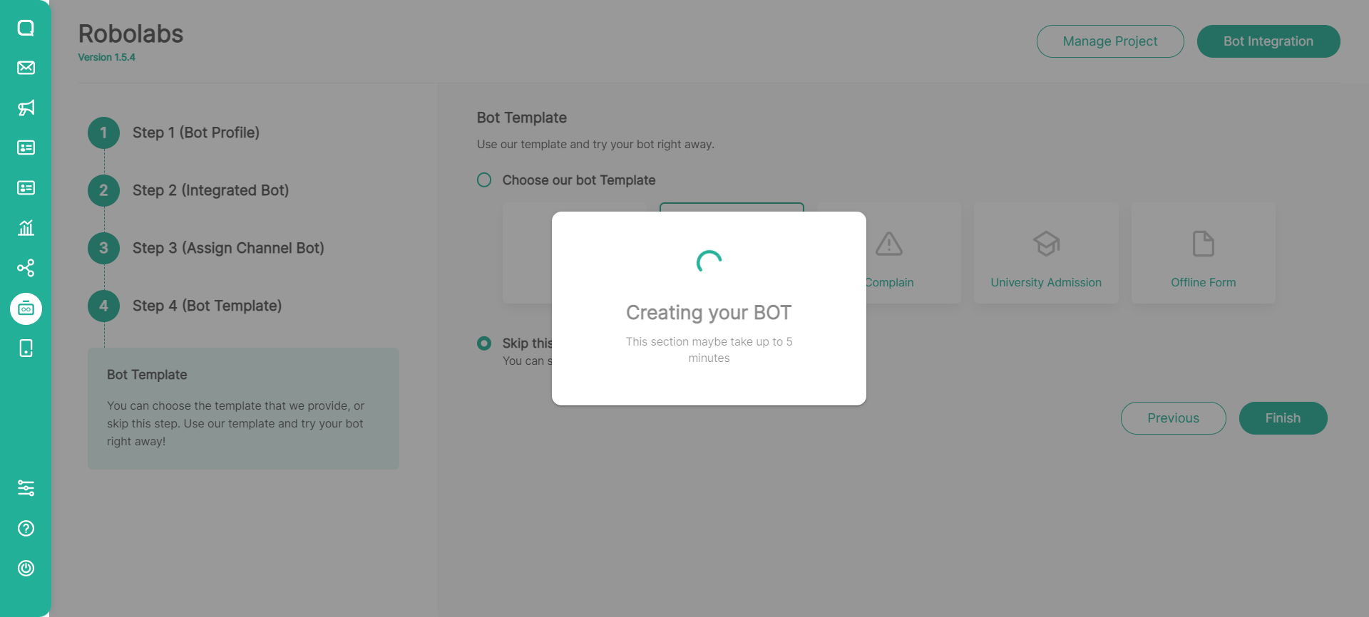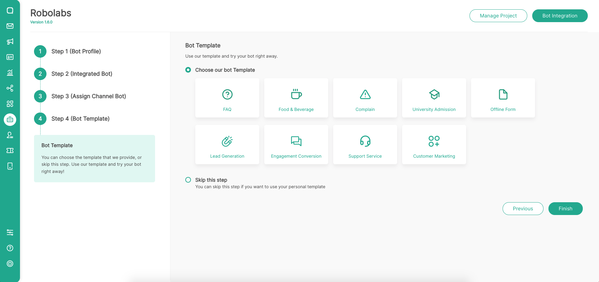 ** Robolabs provides ready-to-use bot templates that you can use. You can choose by selecting a bot template, then the template will be implemented in your bot project. You can also skip this step.