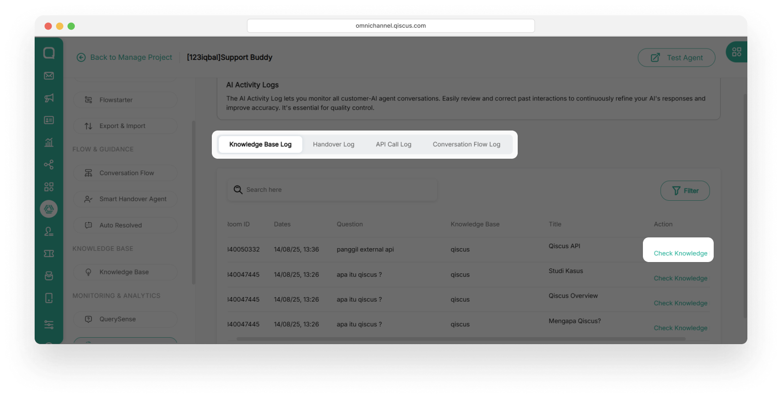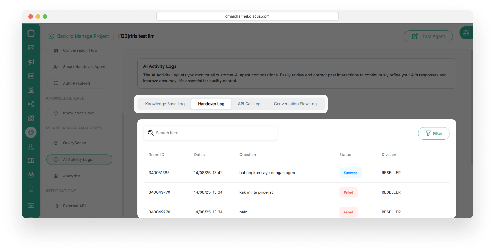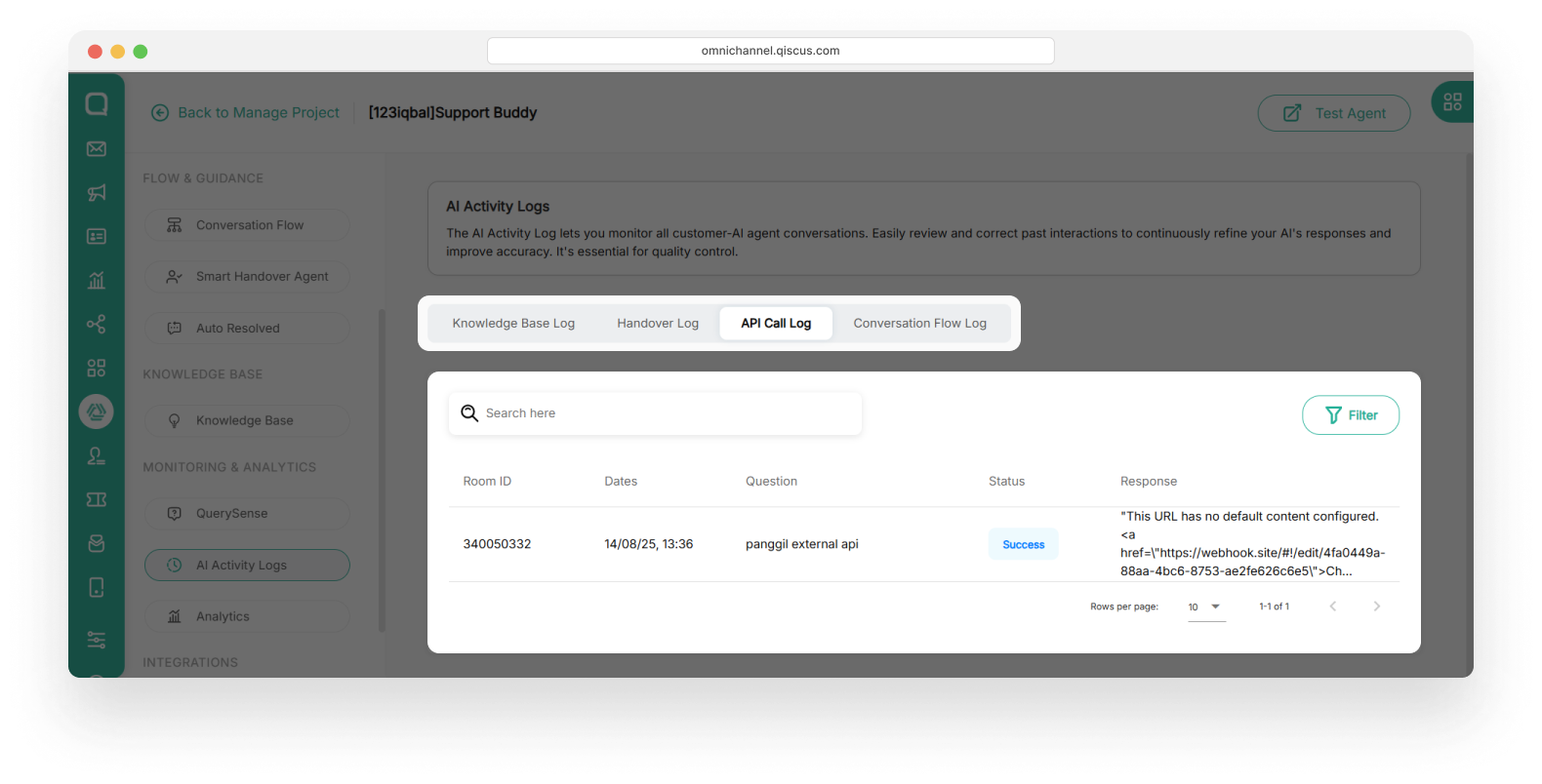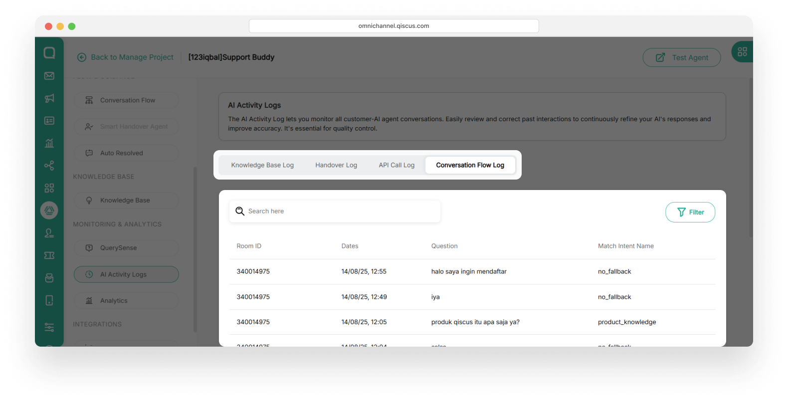 This section allows you to monitor and review the AI Agent’s responses in each conversation room. For every interaction, you can view the room_id, the user’s question, and the AI’s generated response. That is helping you ensure accuracy and context alignment.