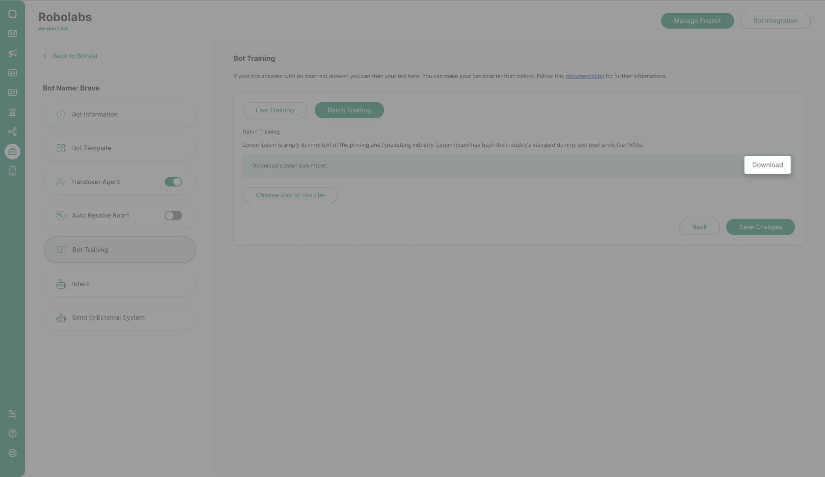If you want to train more than one phrase using the excel file upload mechanism, you can use this Batch Training menu. Here, you can download the sample excel file first, change it, then upload it to Robolabs.