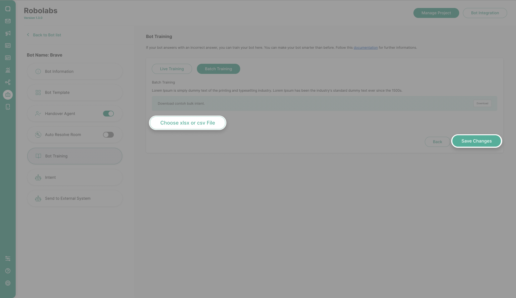 Upload your training bot template by clicking the Choose xlsx or csv file button, then click the Save Changes button.