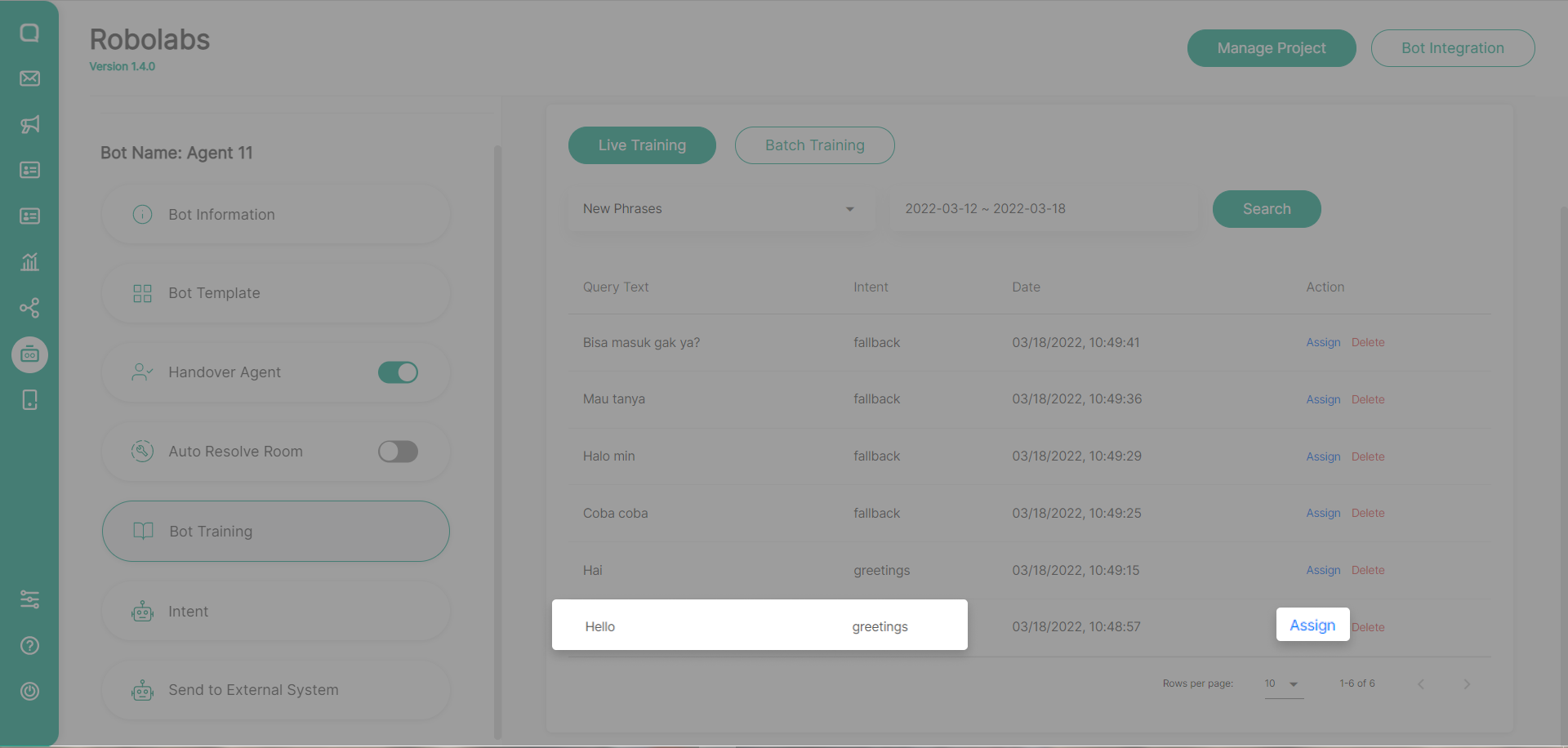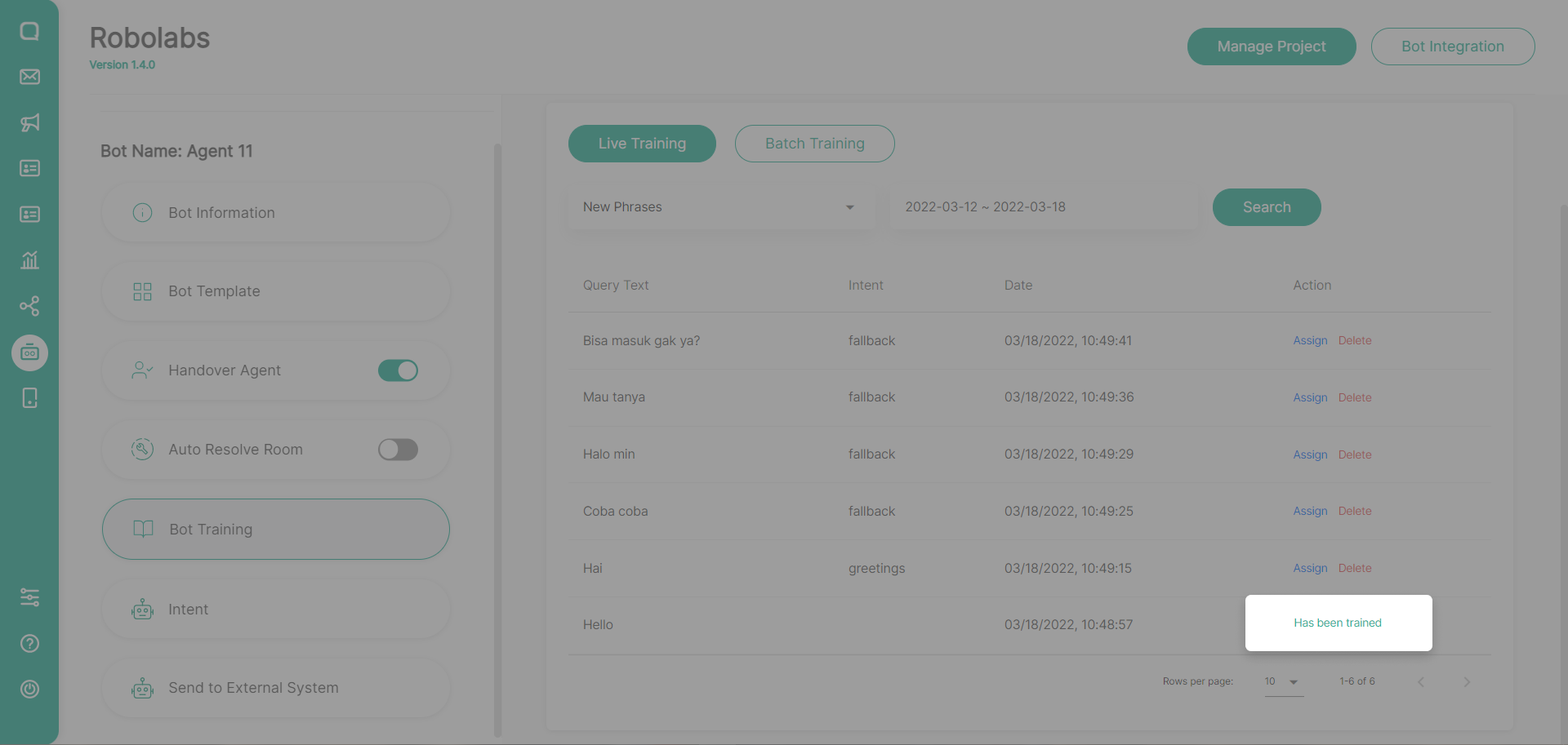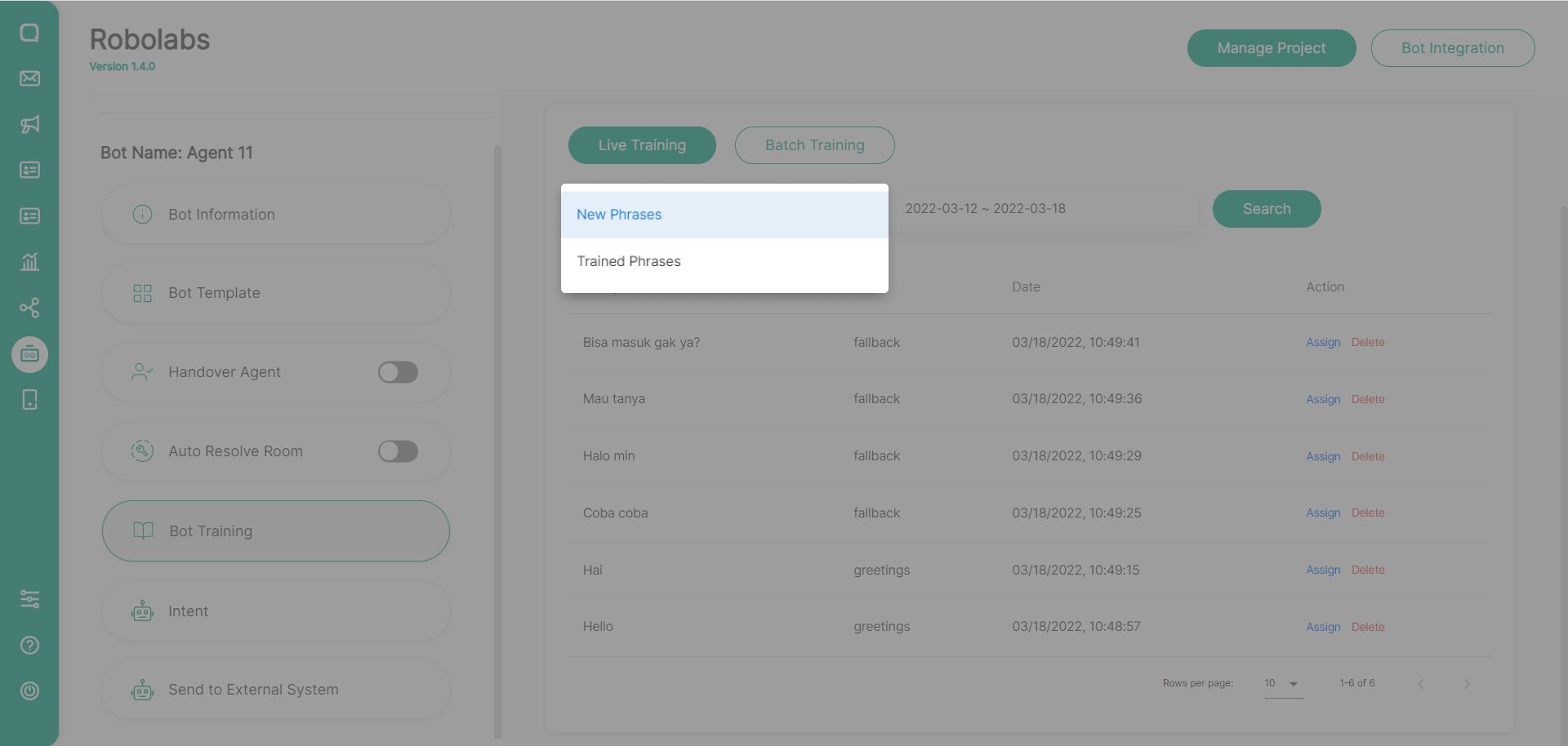 Not always bots can answer correctly. Even so, we can train bots to be smarter in the future. You can train bots at the same times via Live Traning menu. In this menu, there are two things, New Phrases and Trained Phrases. You need to select a time range first to display the data. You can see up to 7 days back.