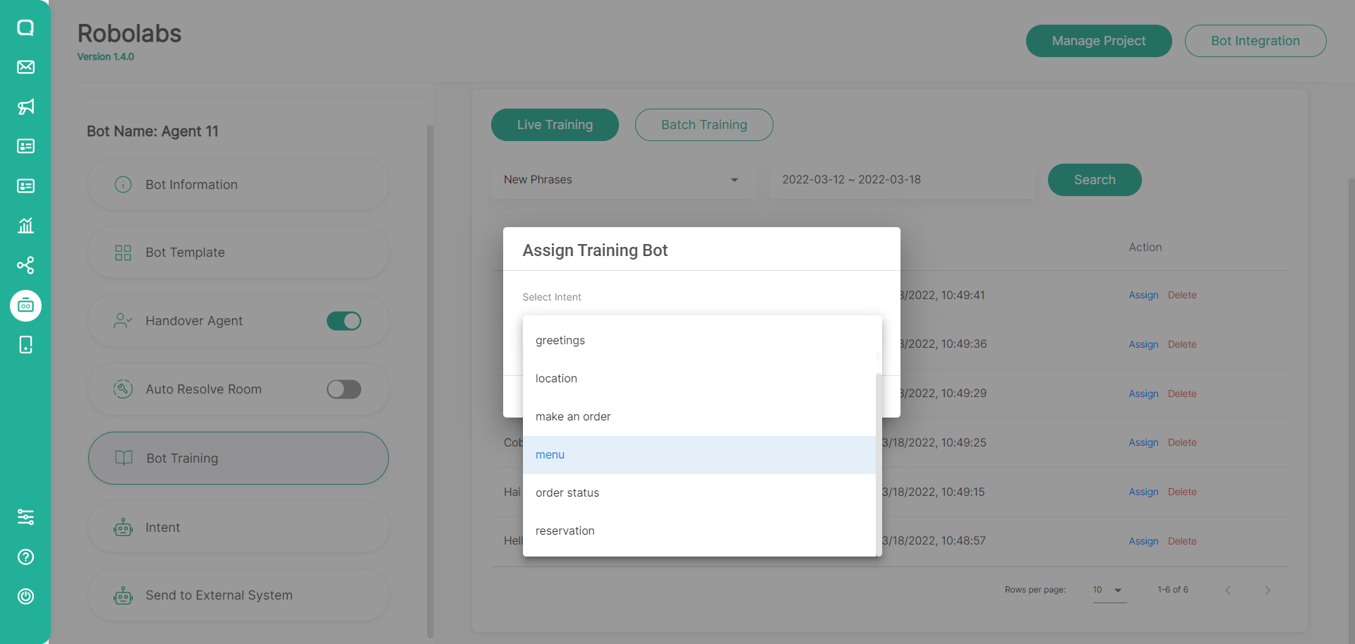 In the following example, the sentence “Hello” is detected as intent greetings. Then we will assign it by moving it to the “menu” intent.