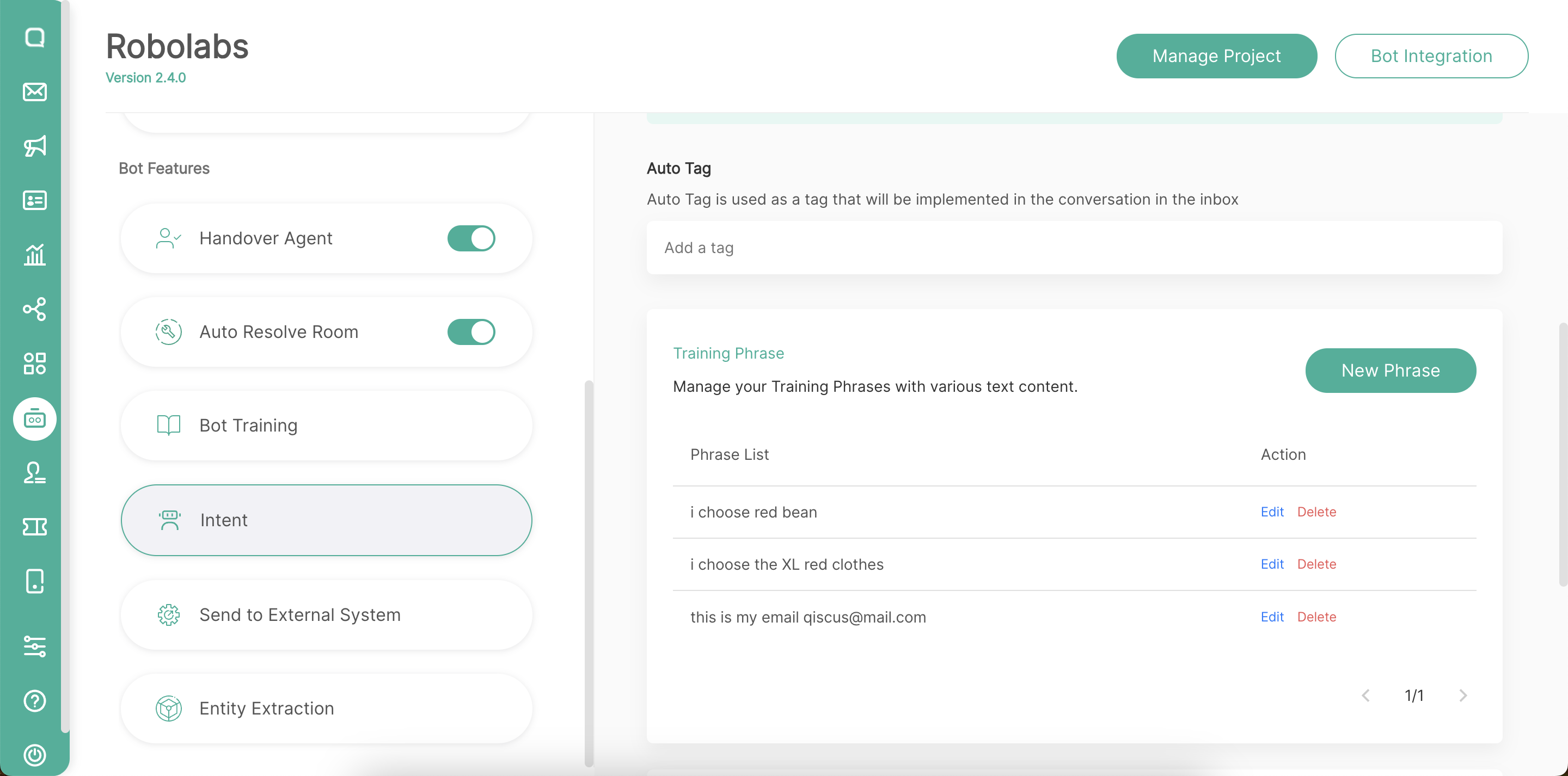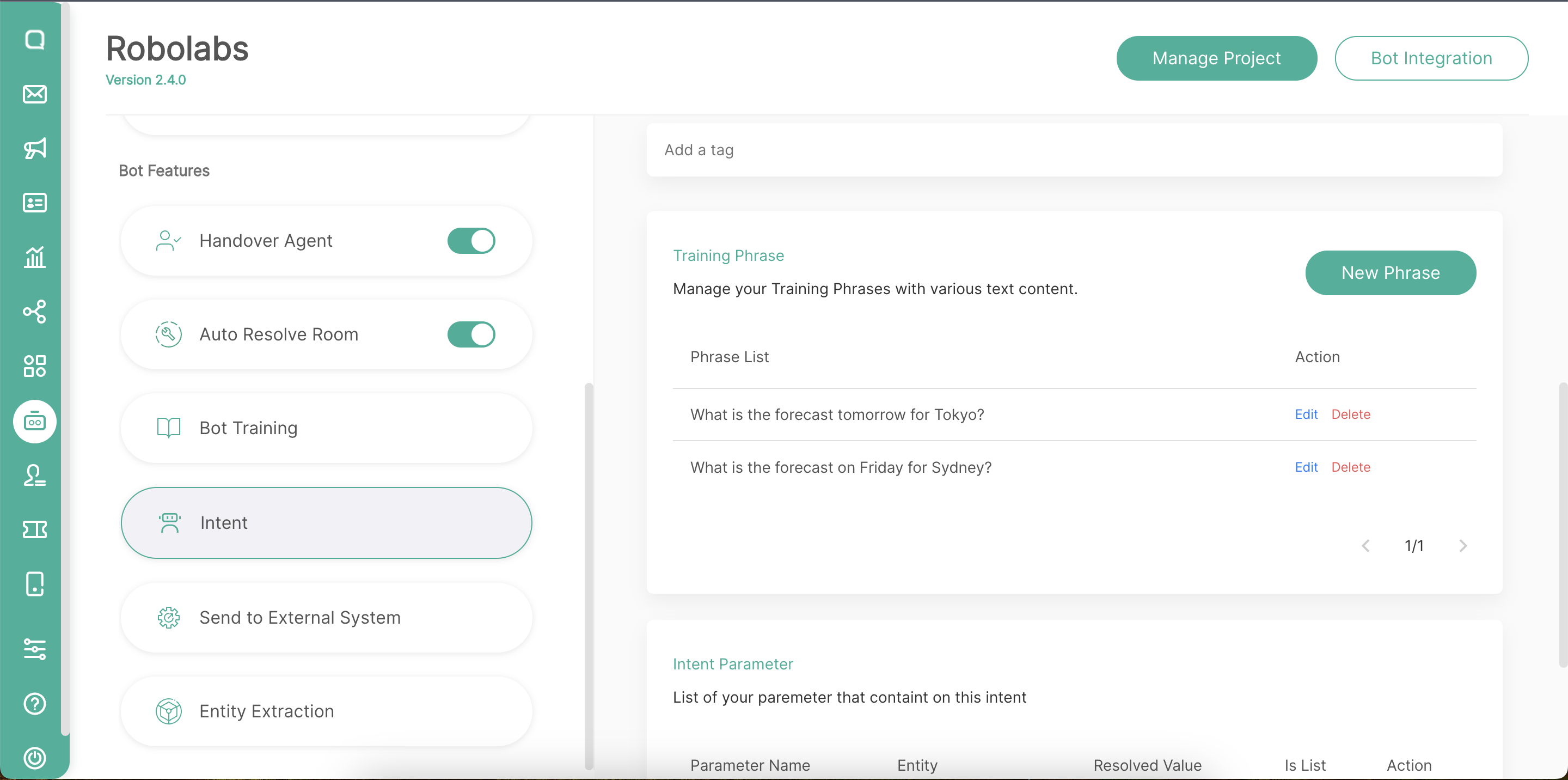 Scroll down to the Training phrases section. You can click New Phrase or edit your trained phrases.