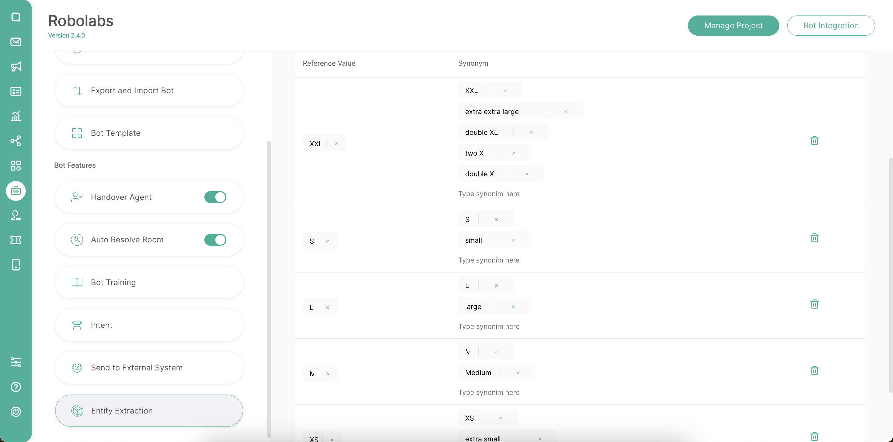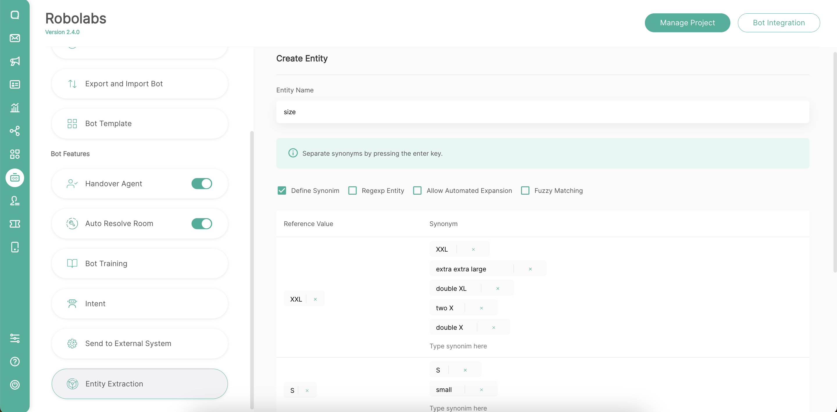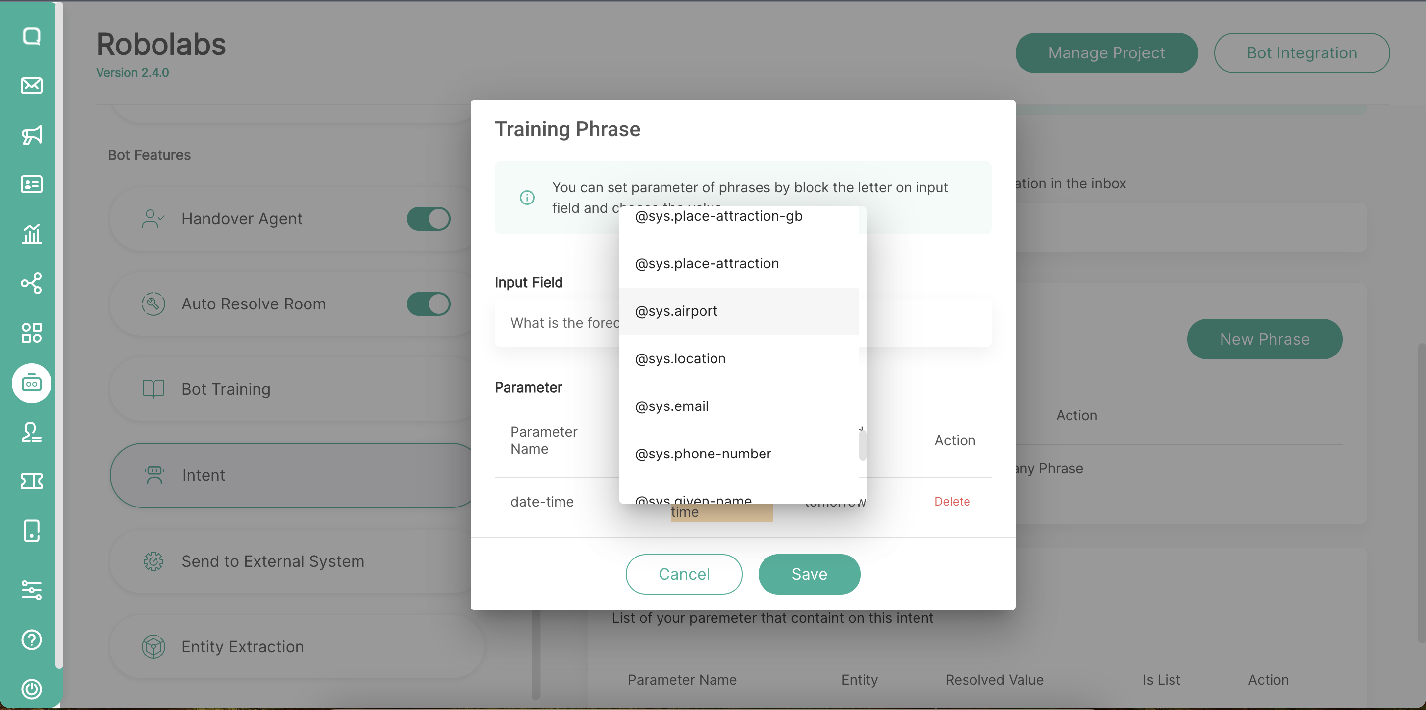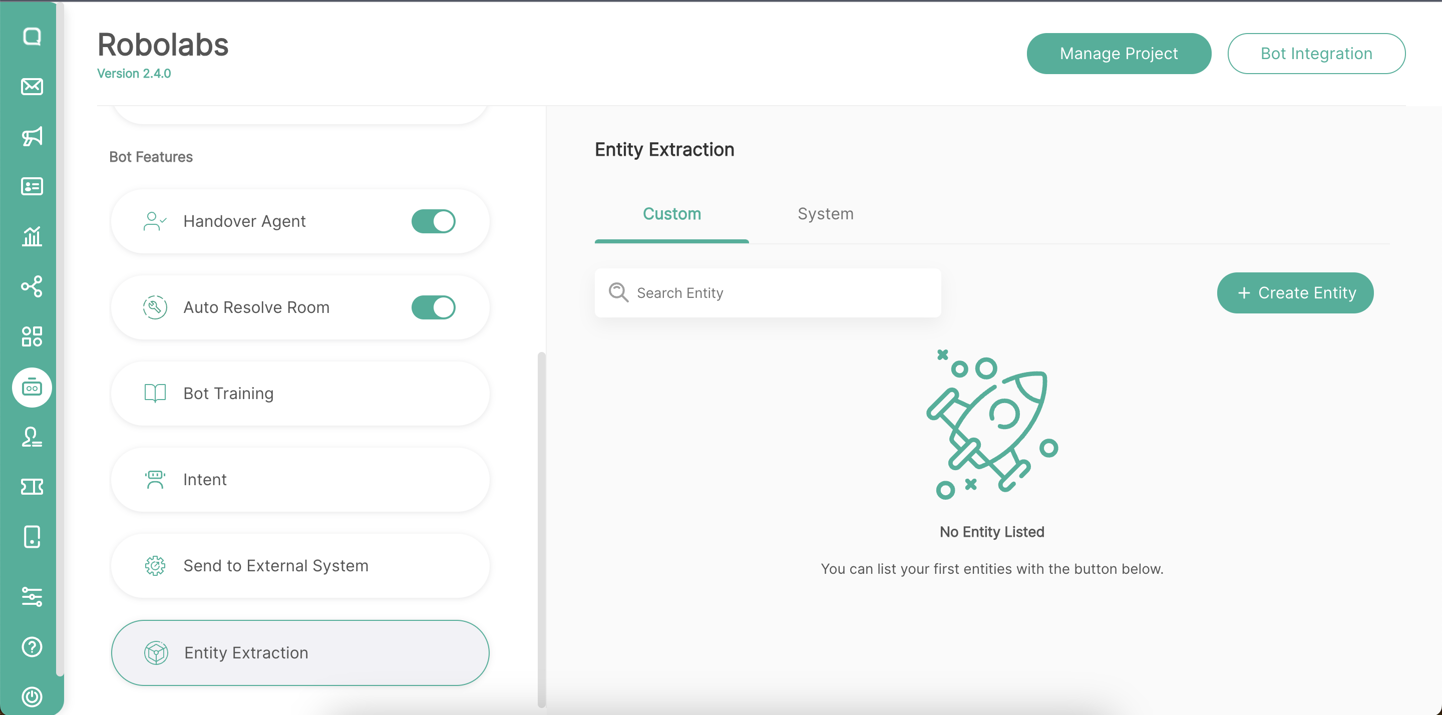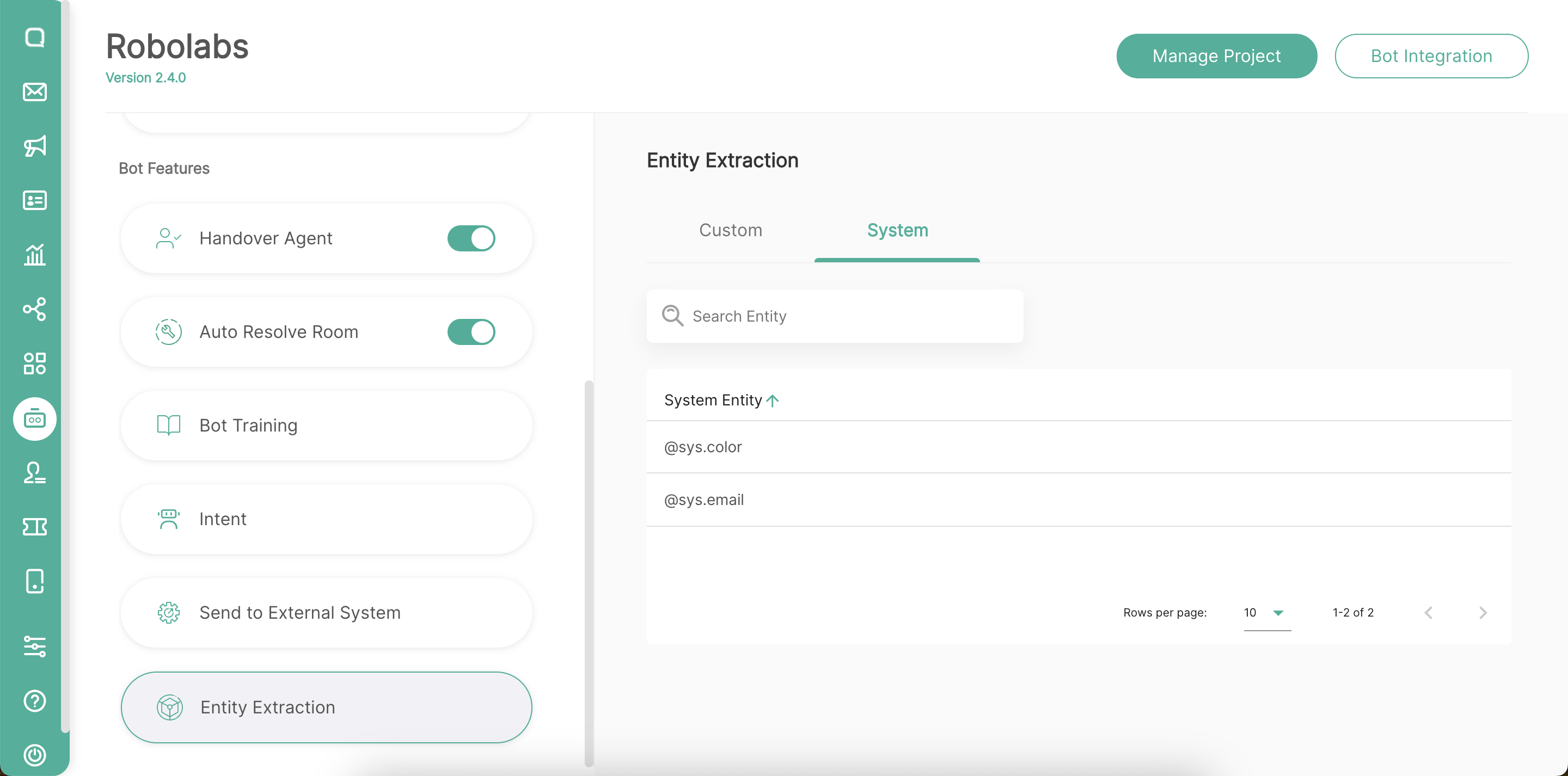 Dialogflow provides predefined system entities that can match many common types of data. For example, there are system entities for matching dates, times, colors, email addresses, and so on. You can also create your own custom entities for matching custom data from Robolabs. For example, you could define a vegetable entity that can match the types of vegetables available for purchase with a grocery store agent.