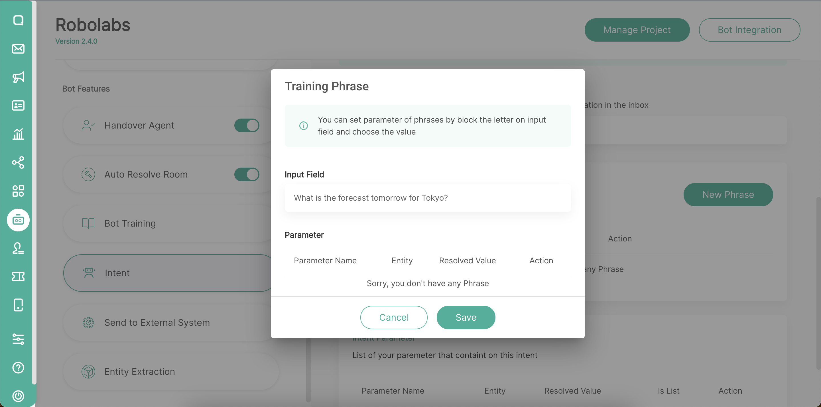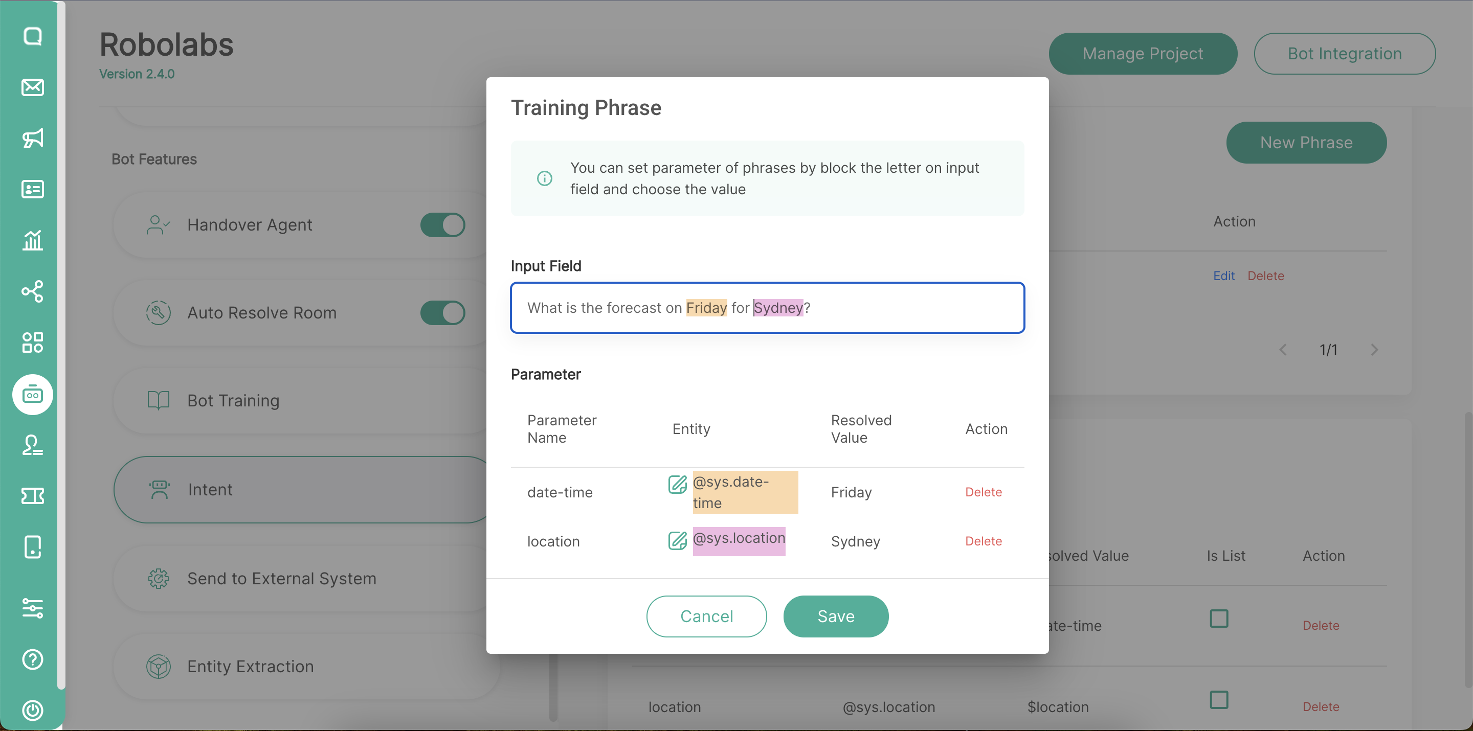 parameter. When you annotate parts of a training phrase, Dialogflow recognizes that these parts are just examples of actual values that will be provided by end-users at runtime. For an end-user expression like "What is the forecast on Friday for Sydney?", Dialogflow would extract the date