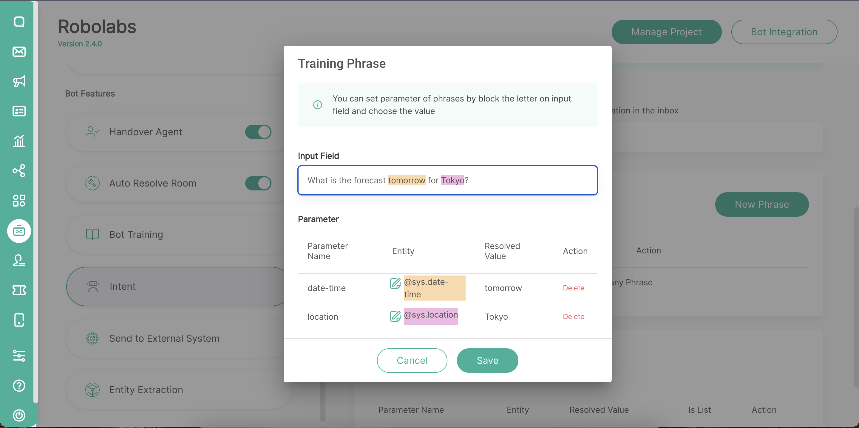 When building a bot, you control how data is extracted by annotating parts of your training phrases and configuring the associated parameters.