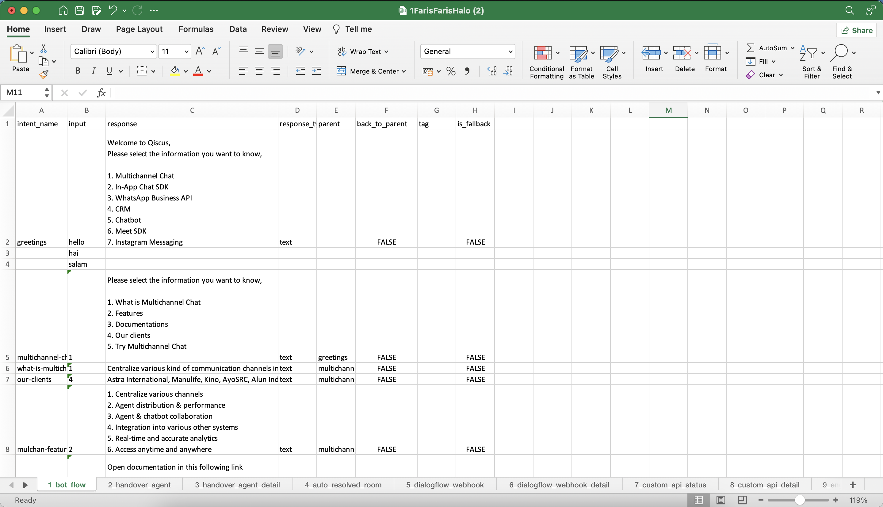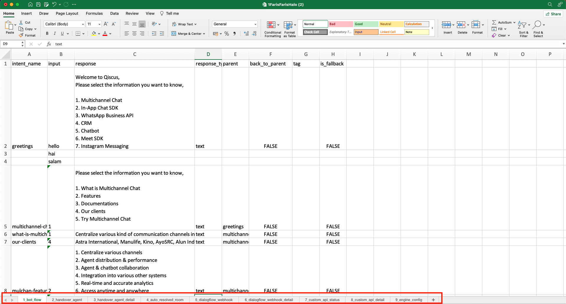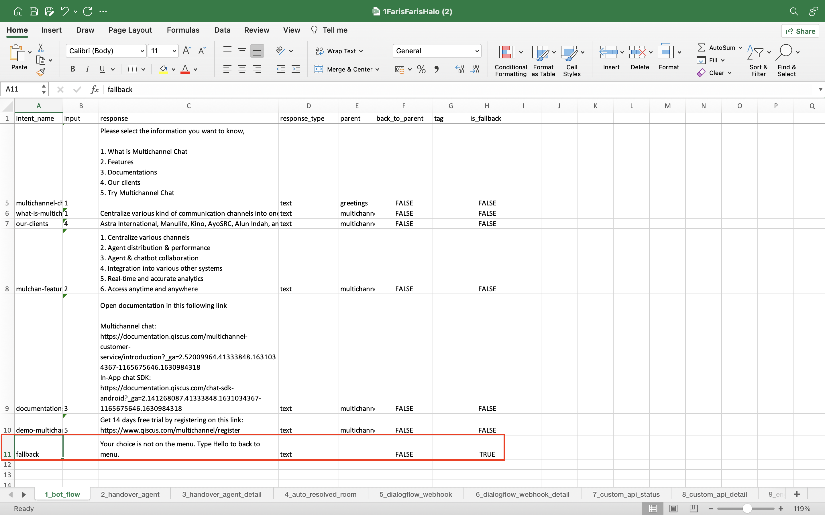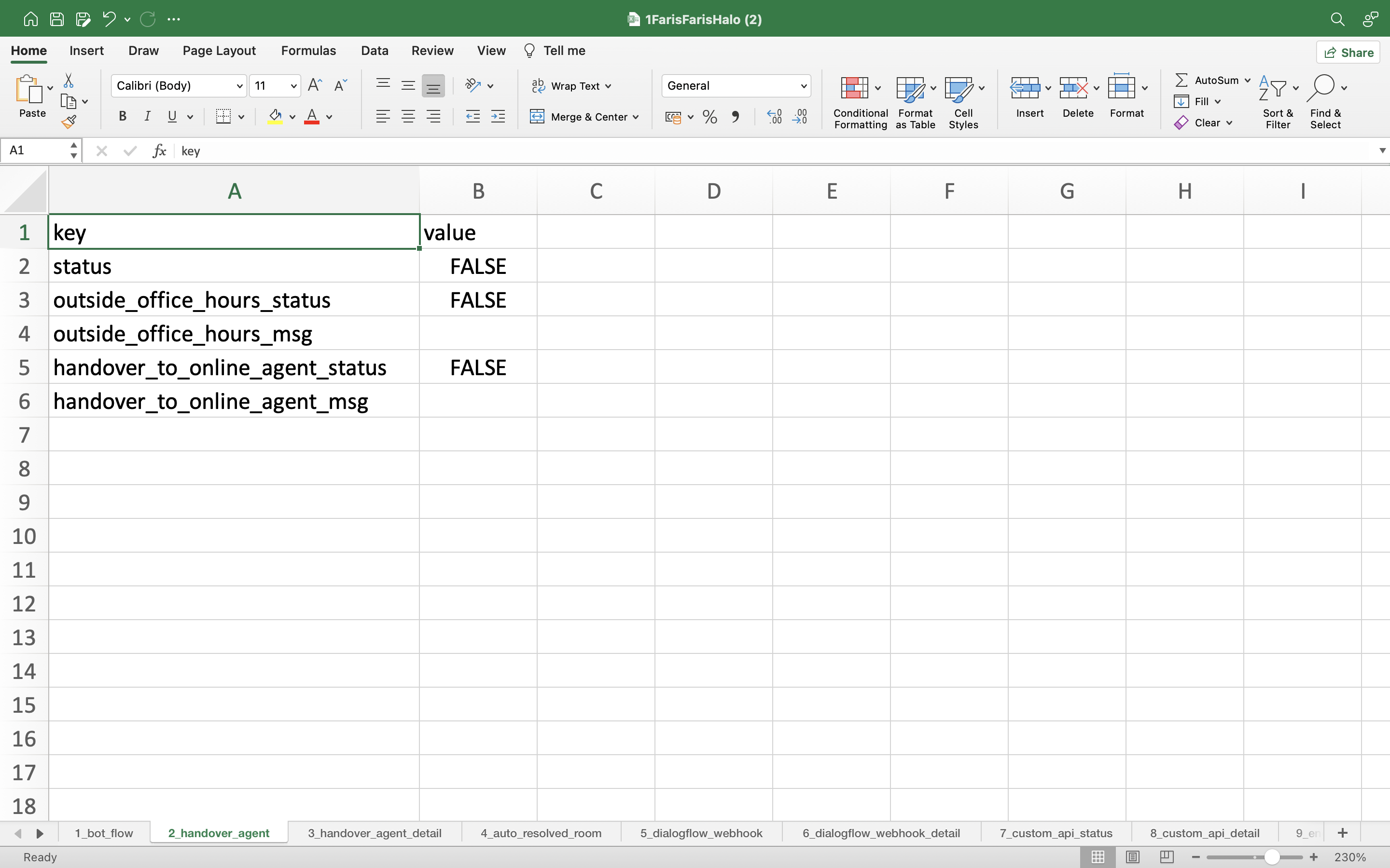- handover_to_online_agent _status: You can activate the Handover to Online Agent feature on this sheet, select TRUE to activate and select FALSE to deactivate.