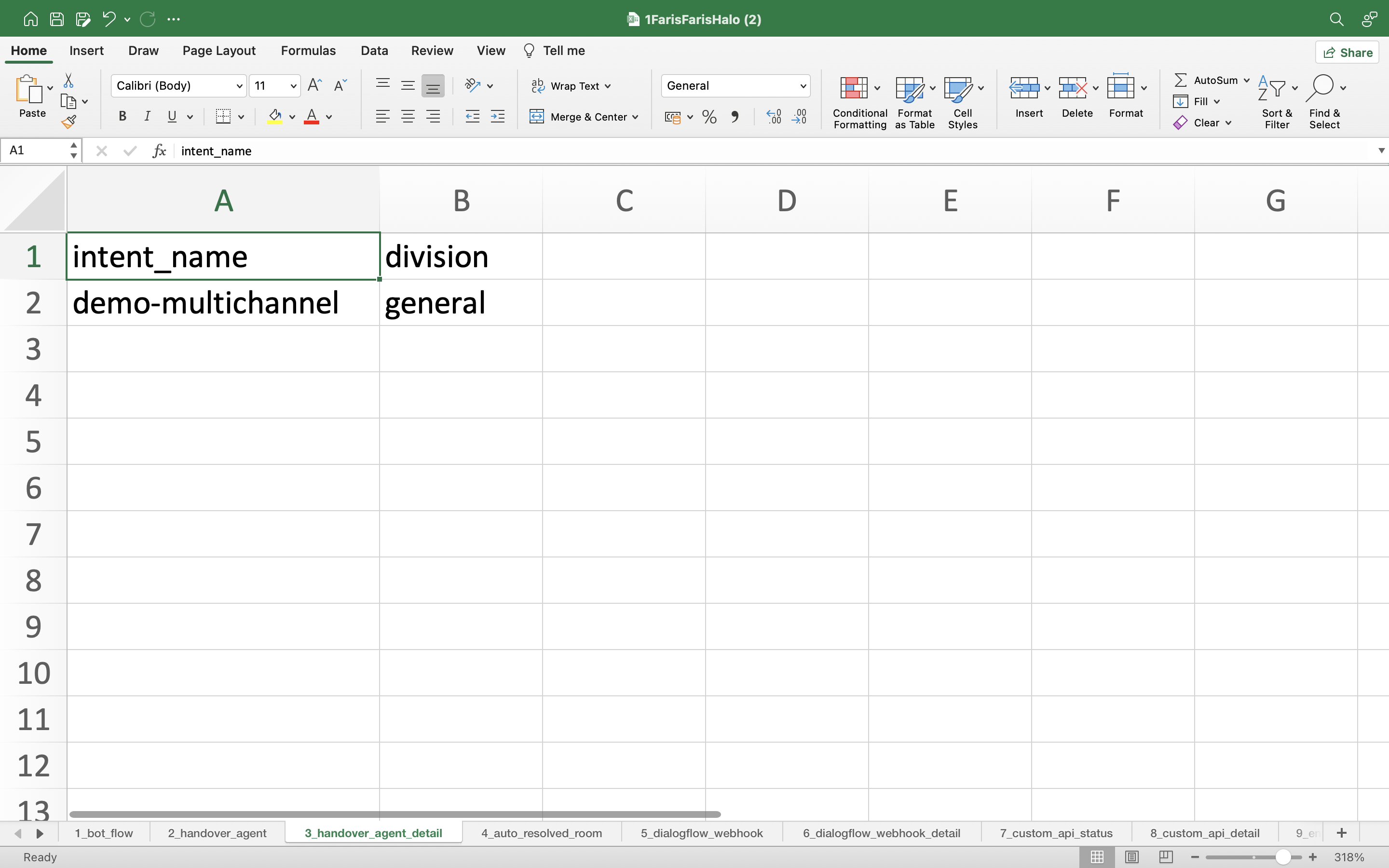 - intent_name: Intent is a question mapping that will be asked from the user to the bot. You can categorize these conversations into an intent, where the intent has the input and response you specify. From the template, there are intents that already exist in the Dialogflow project, namely fallback and greetings.