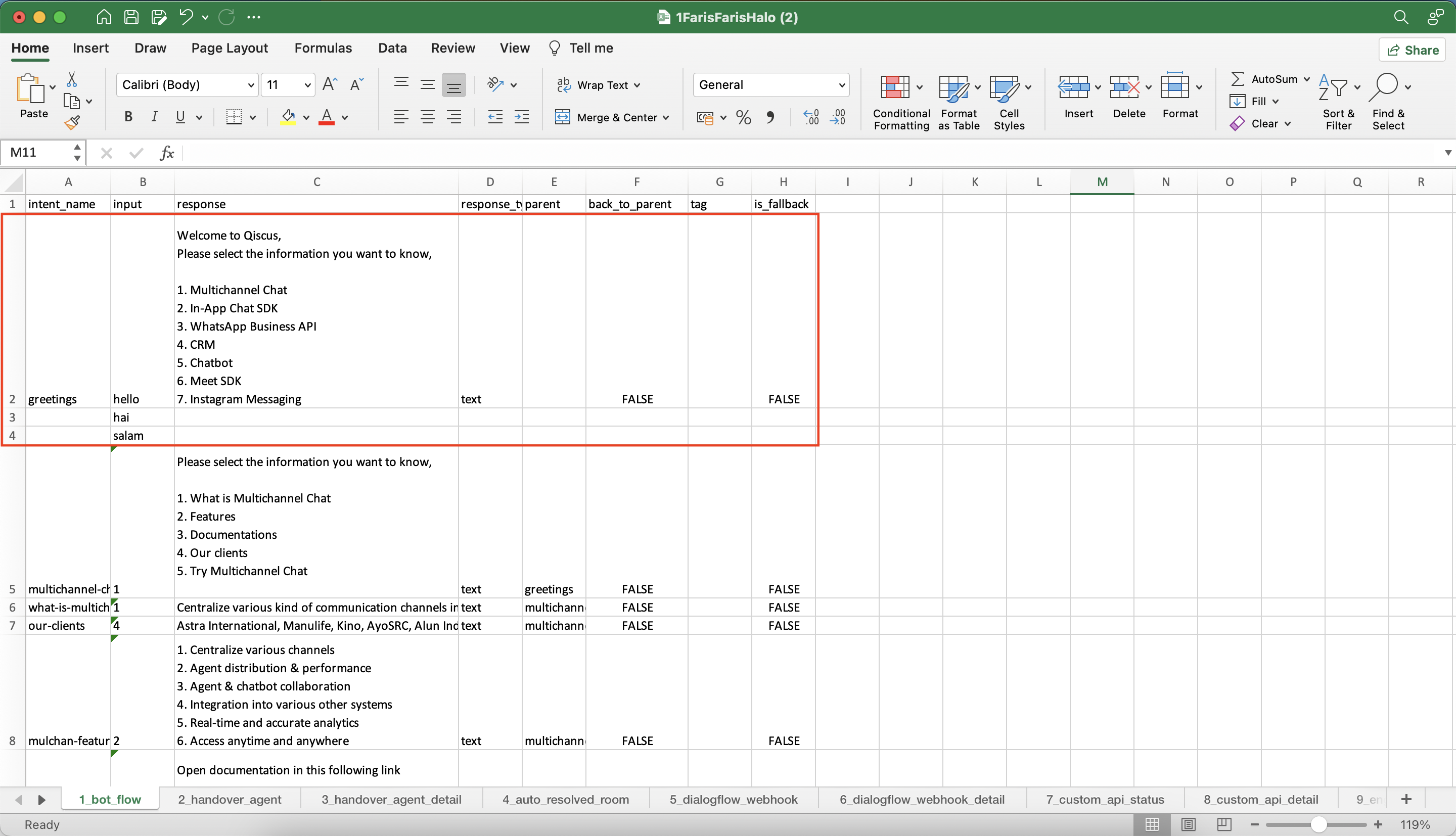 parent: The parent has a function to know if the intent has a parent from that particular intent or not. For example, the multichannel chat intent is located on the greetings menu. Every user who enters the Multichannel Chat menu must enter greetings first before entering the Multichannel Chat menu. Hence, the parent of the Multichannel Chat intent is greetings.