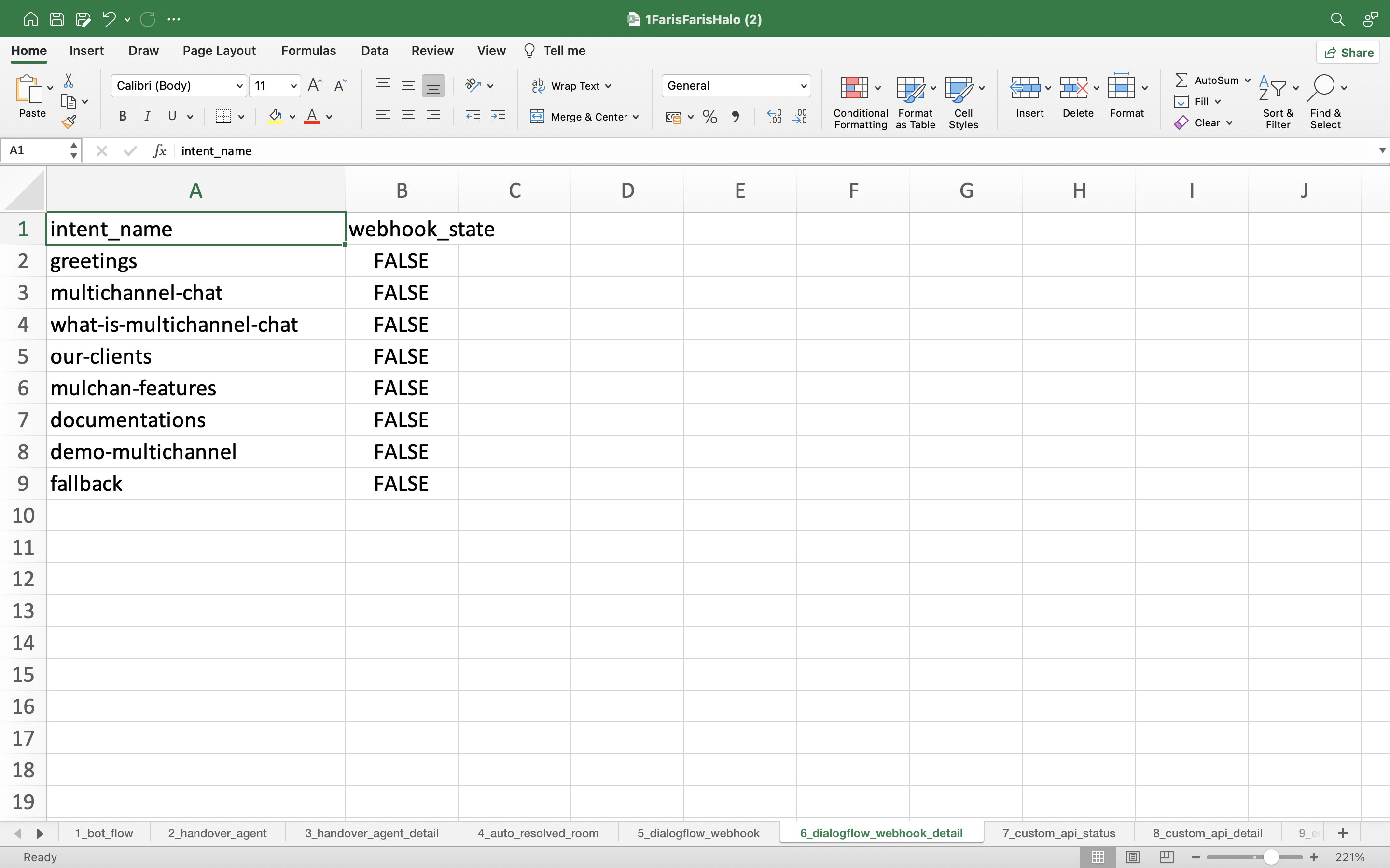 - status: You can activate the Dialogflow Webhook in External System feature in this sheet, select TRUE to activate and select FALSE to deactivate.