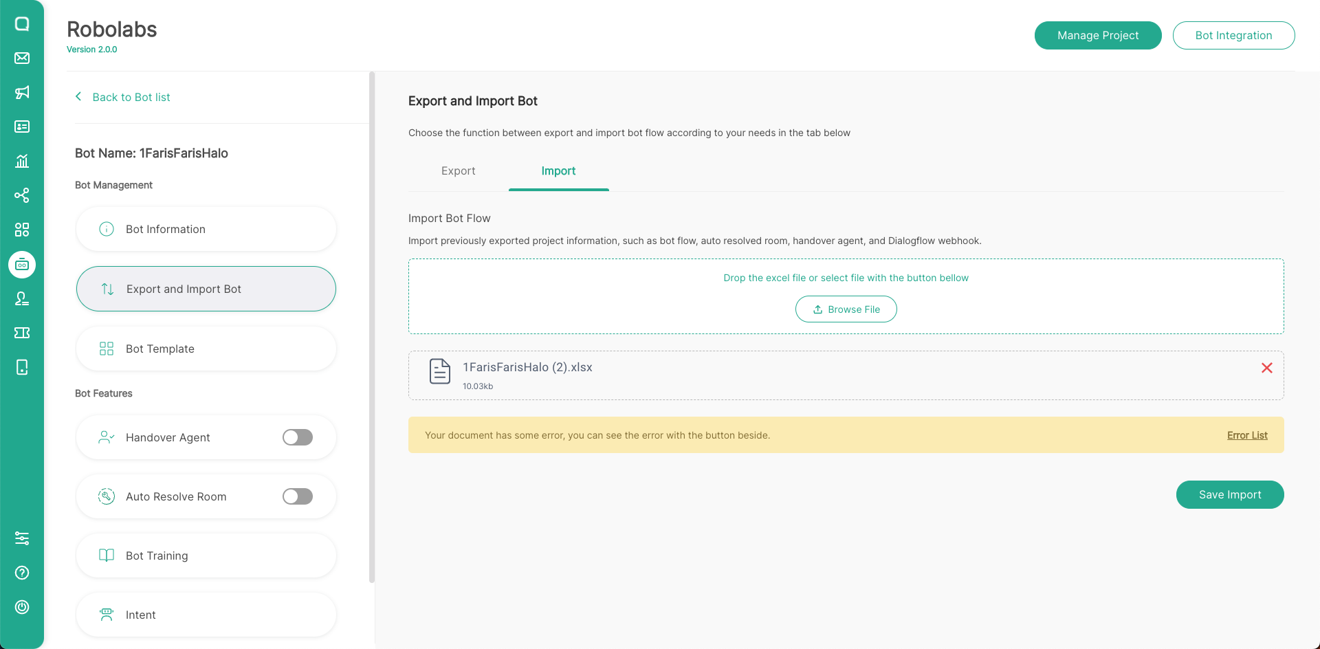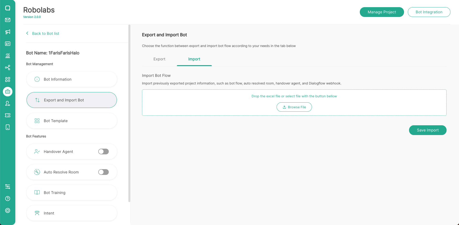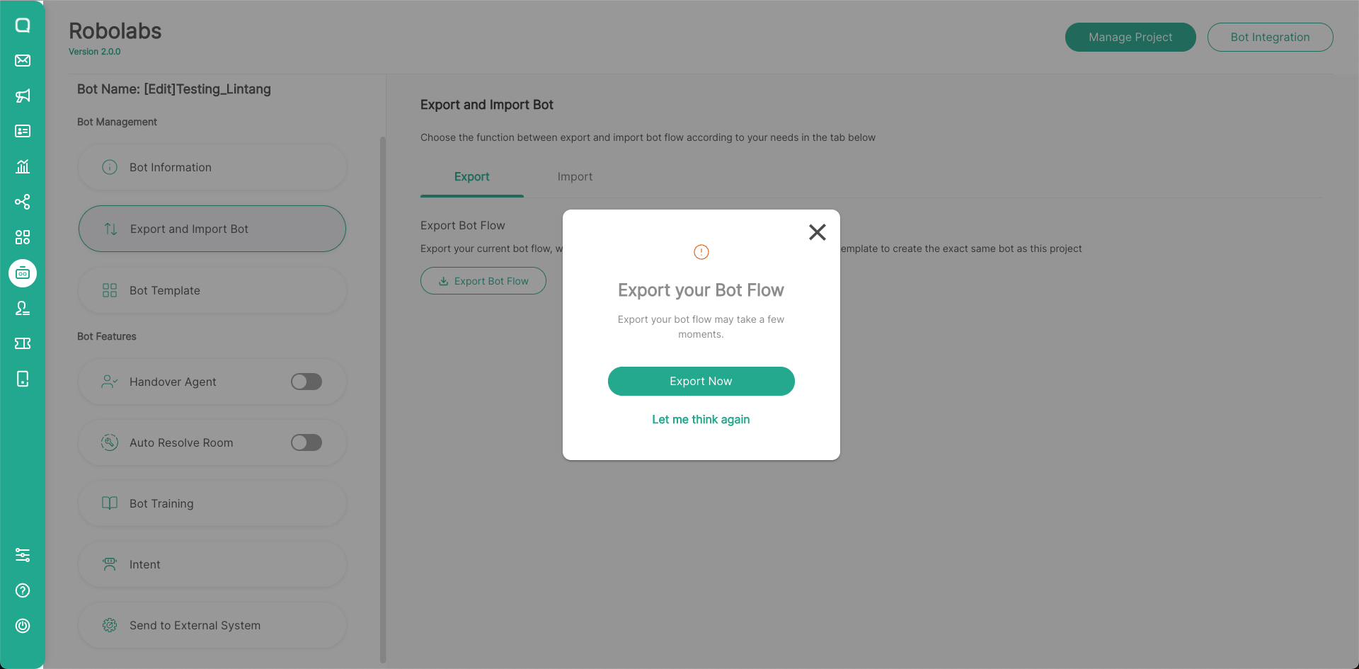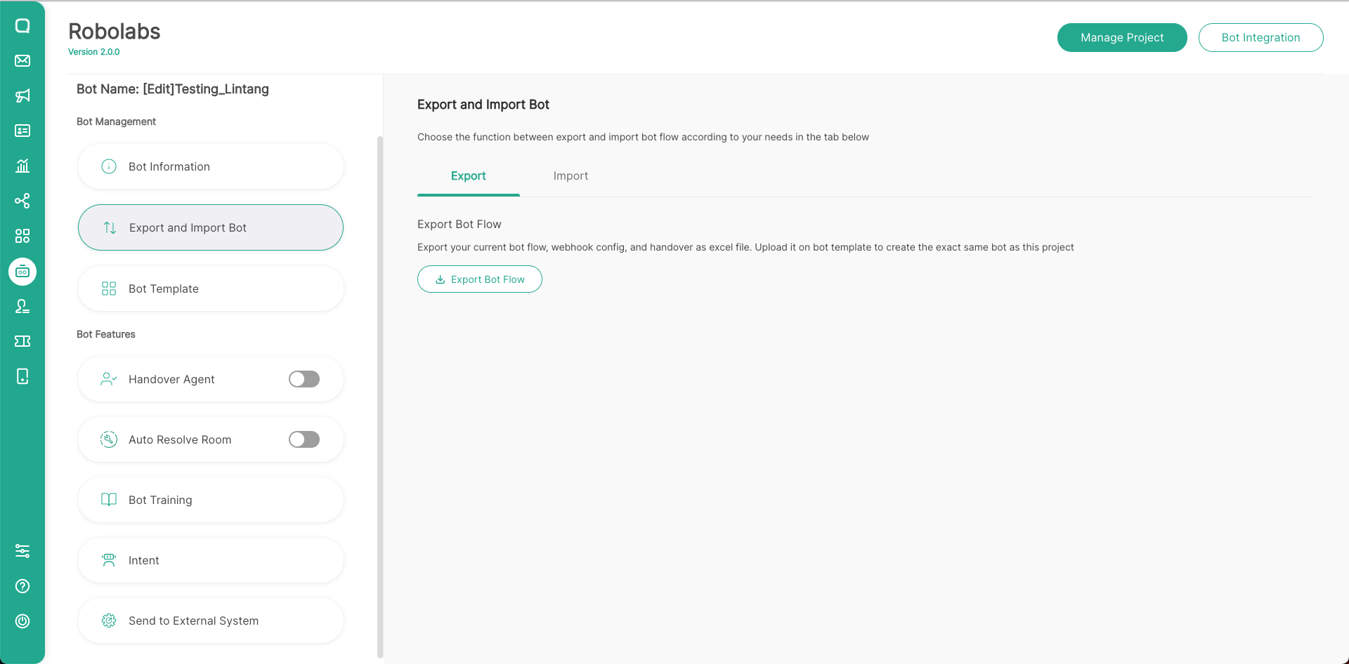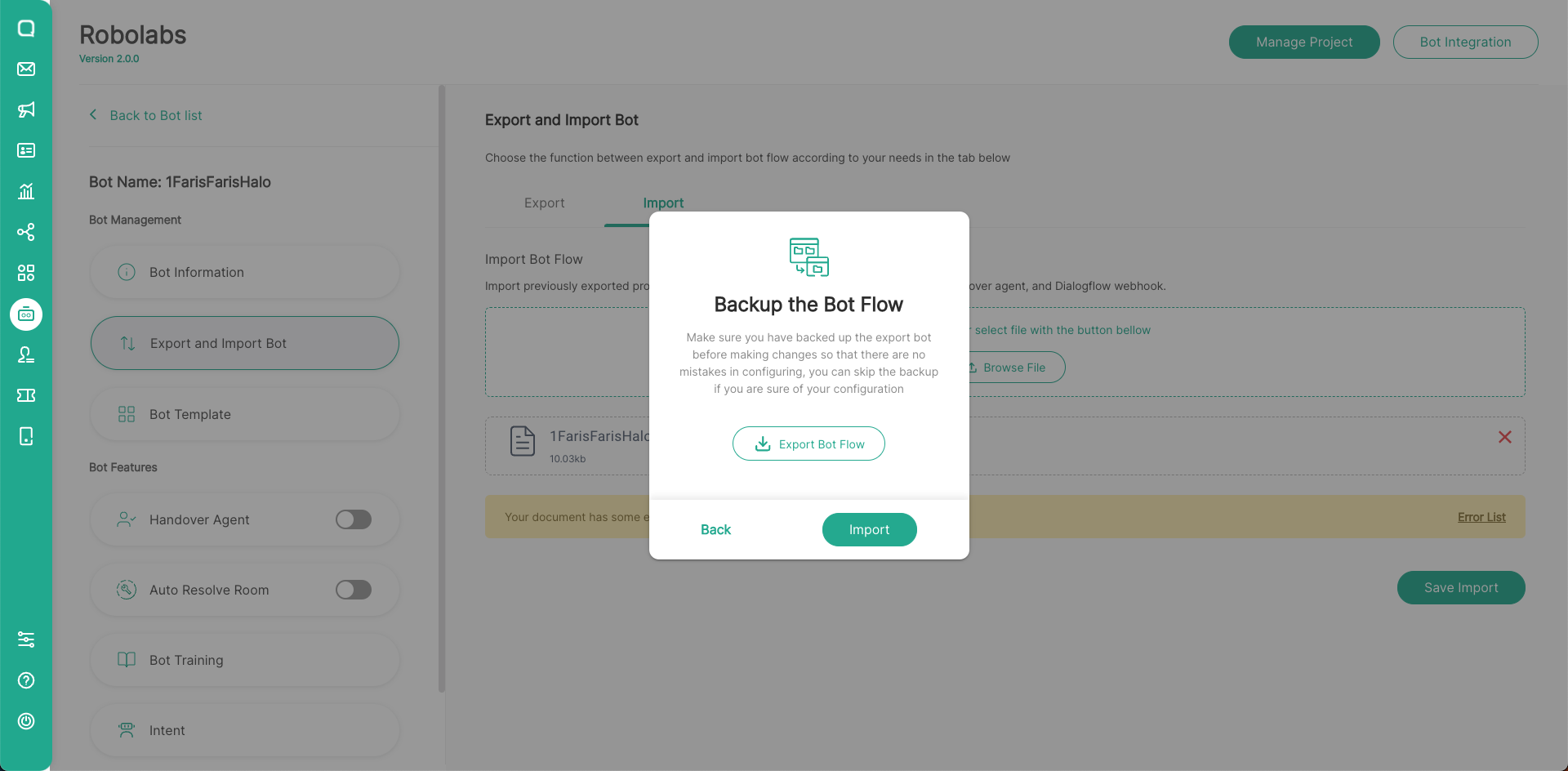 - Because the Import Bot will replace all changes in the bot project, make sure you have backup the bot flow first if the new changes bot flow don't suit your needs. Click Export Bot Flow to export existing bot flow. After that, click Import.