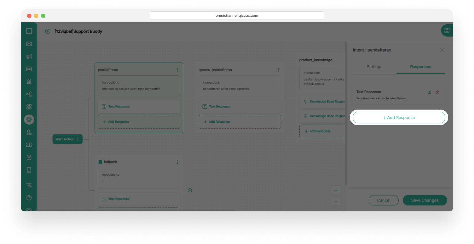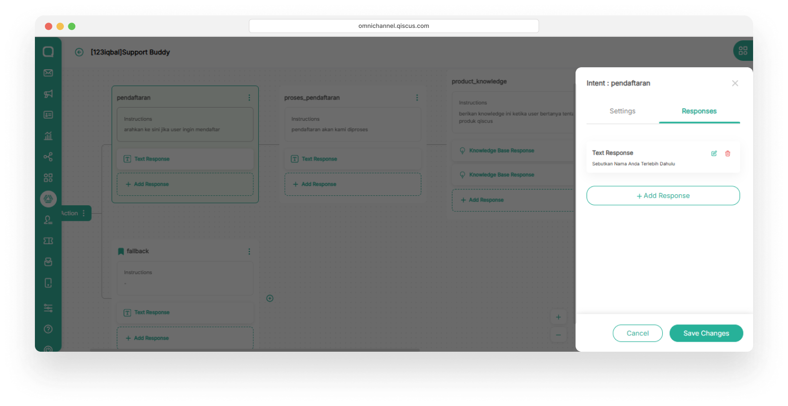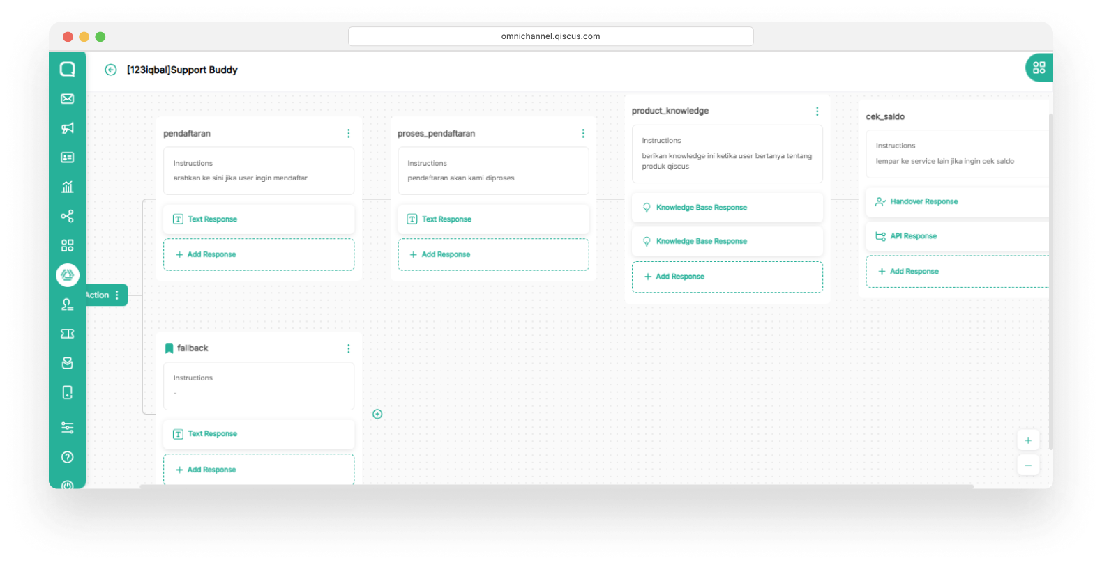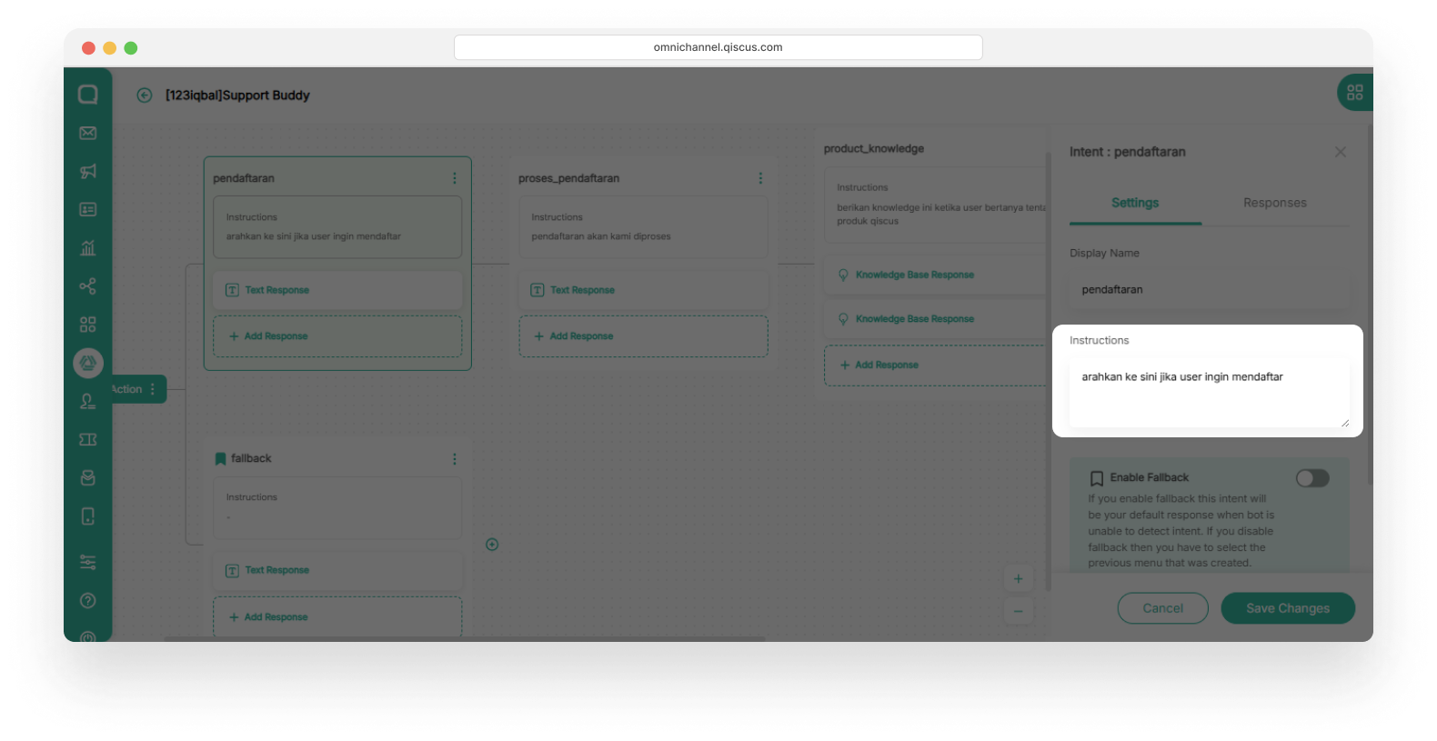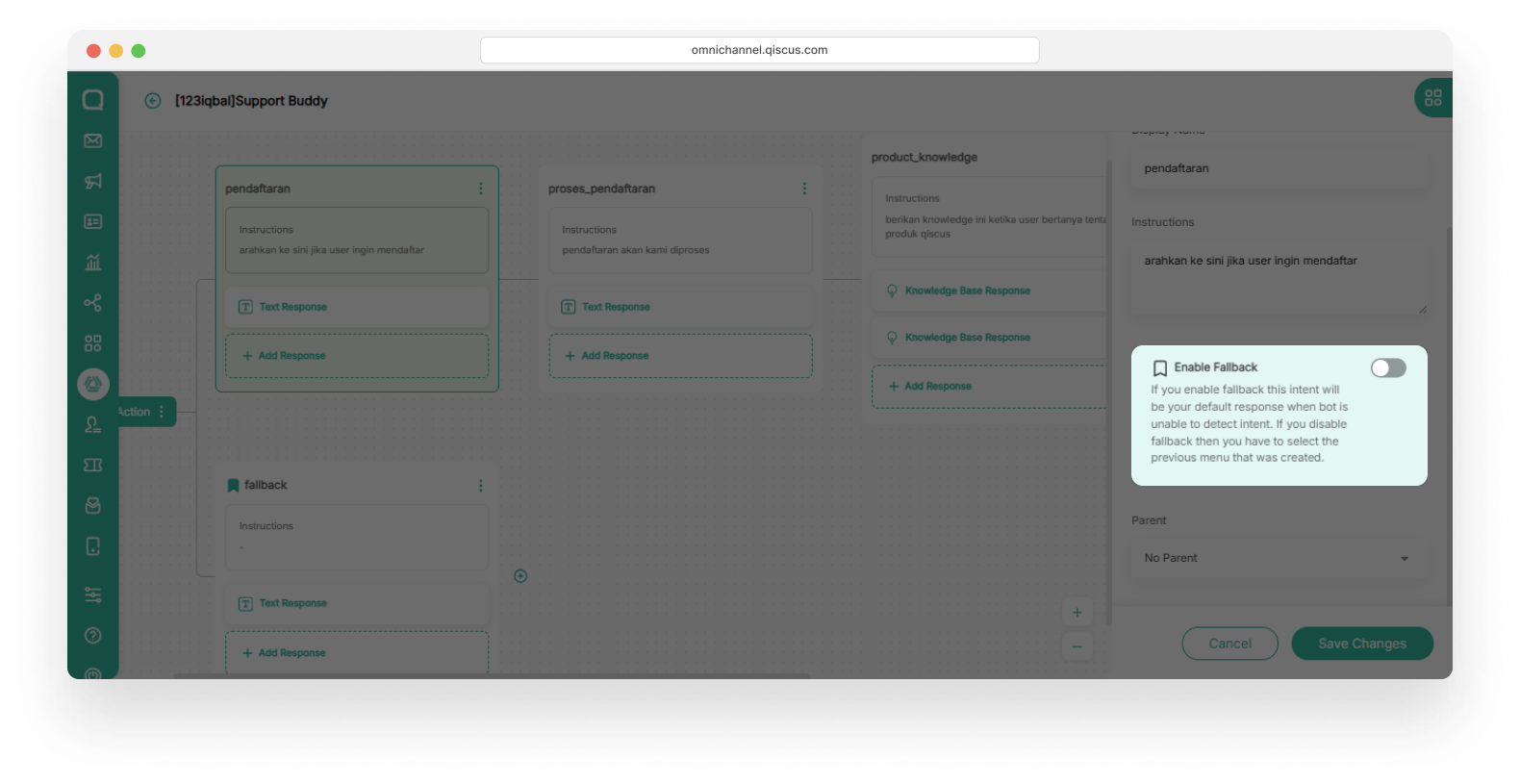 On this page, you can create intent based on the desired flow. The intent can have a parent and child, make it a fallback intent, instructions in the form of prompts as triggers to the intent, and also add responses from the LLM.