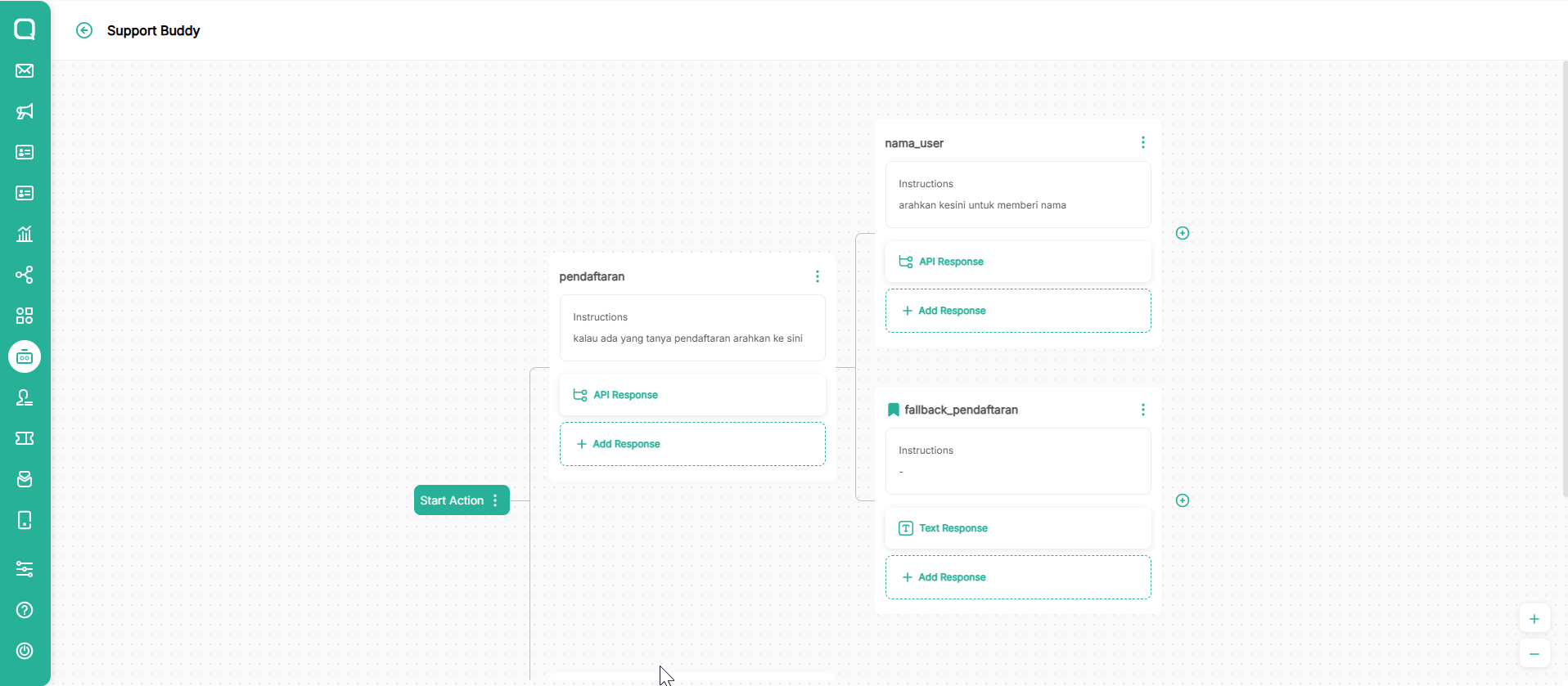 the AI Agent will detect that this message matches the "pendaftaran" intent. Inside this intent, a Prompt-Based API Response is configured to trigger an API call using a pre-defined prompt template.