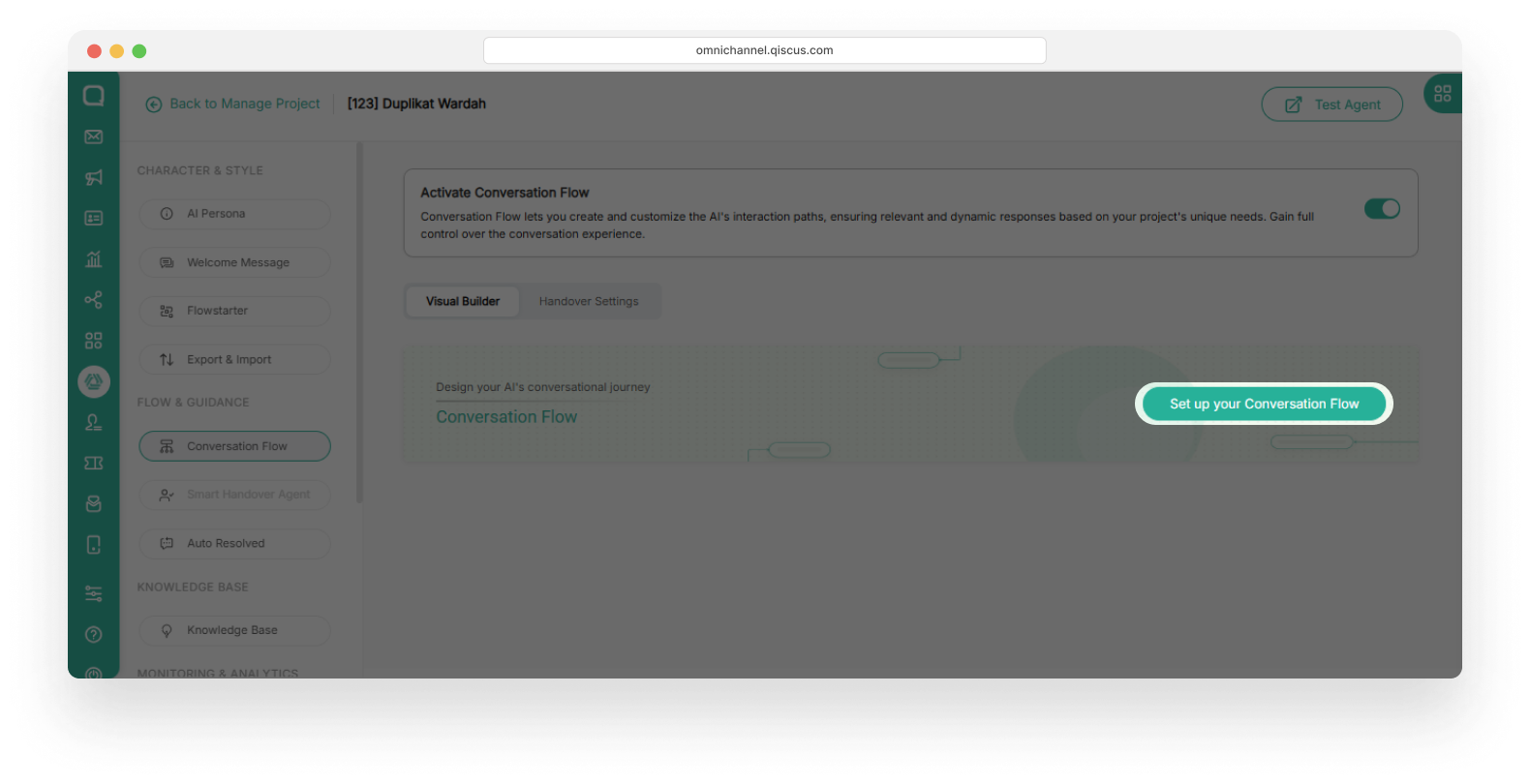 - You can access this feature in your LLM project bot, activate it first via the toggle button and then click Set Up Your Conversation Flow button