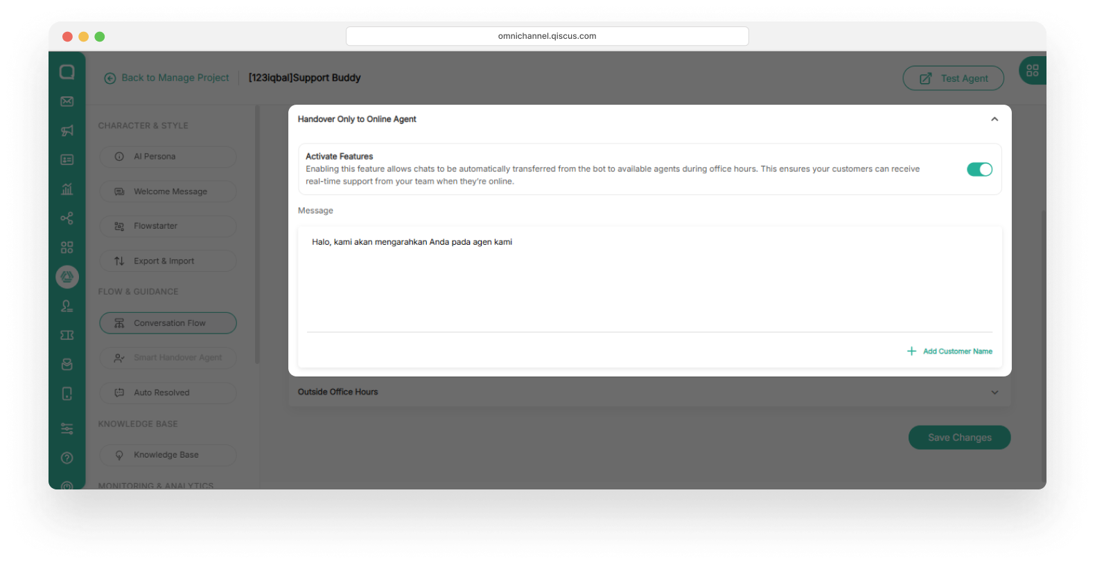 After configuring either the Handover to Online Agent or Handover Outside Office Hours settings, please click the Save Changes button to apply your updates.