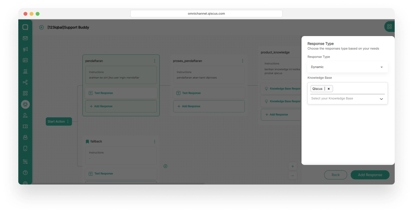 The dynamic response in Robolabs LLM enables the AI Agent to deliver real-time answers by retrieving data directly from the project's knowledge base. The answers provided will be carried out directly by LLM from the knowledge data that you previously uploaded. You can choose which type of knowledge will respond to the intent.