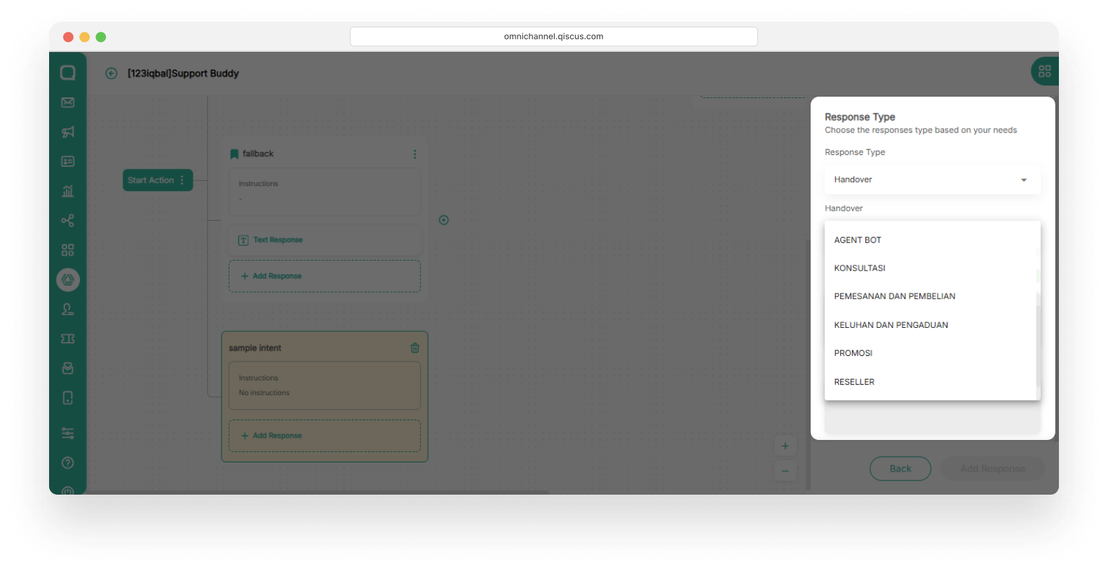 The response here will give the AI a command to handover to the agent when the match is in the intent. Throw the conversation according to the desired division so that AgentLabs and Omnichannel forward the conversation to the agent in that division.