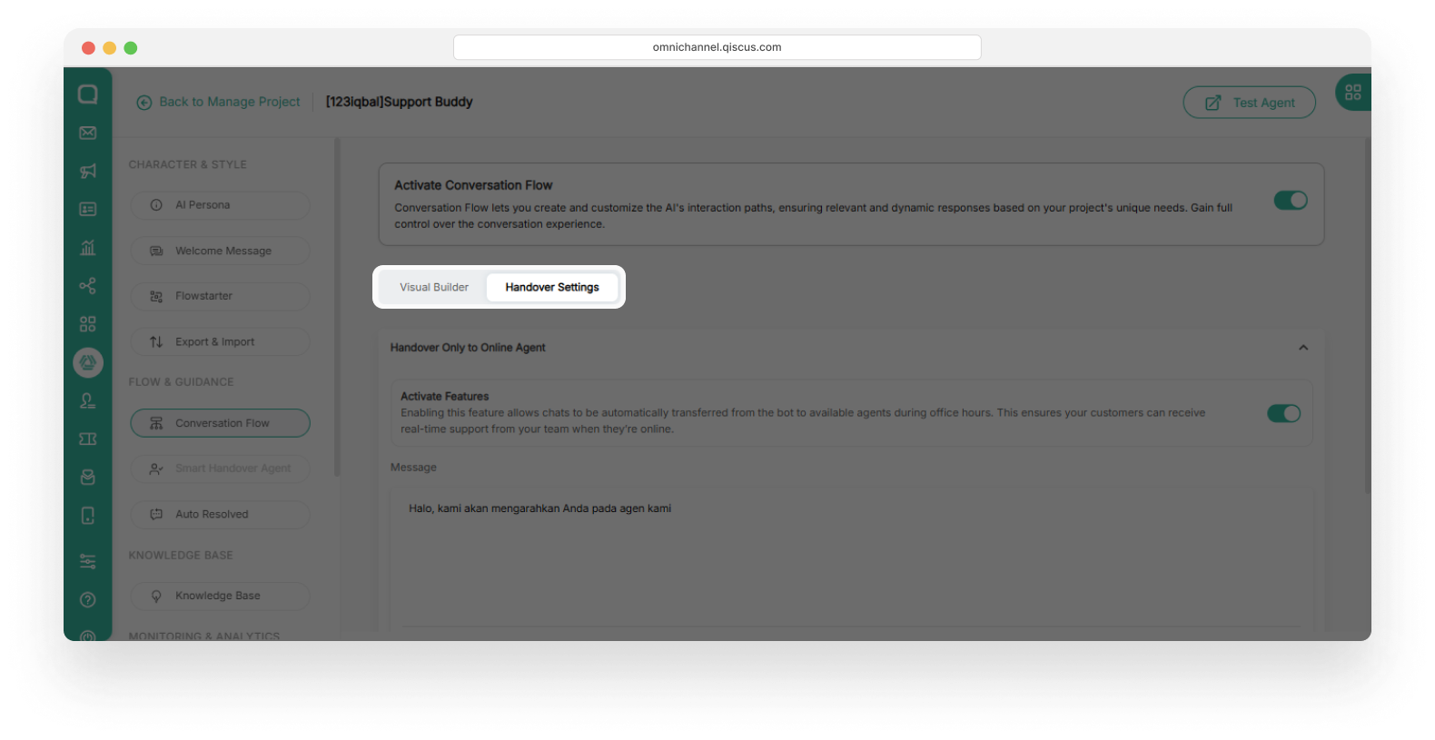 These settings control how and when the bot transfers conversations to human agents. Proper configuration ensures that handovers happen only under the right conditions, such as when agents are online or during working hours