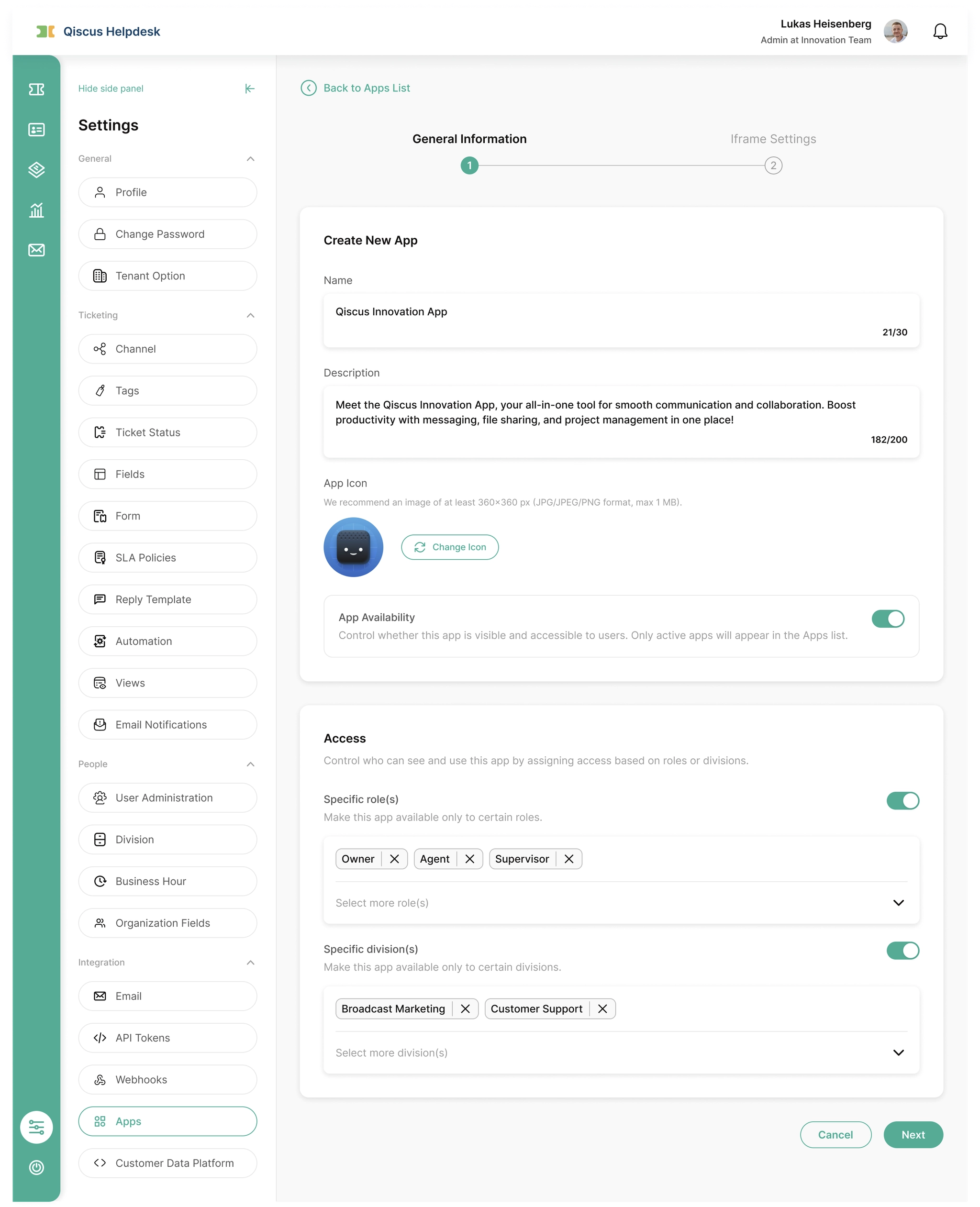 Admins and Owners can create and configure Apps from the Helpdesk settings.