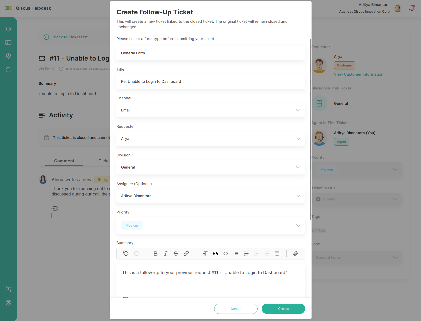 - When opening a Closed ticket, a Create Follow-Up option is available.