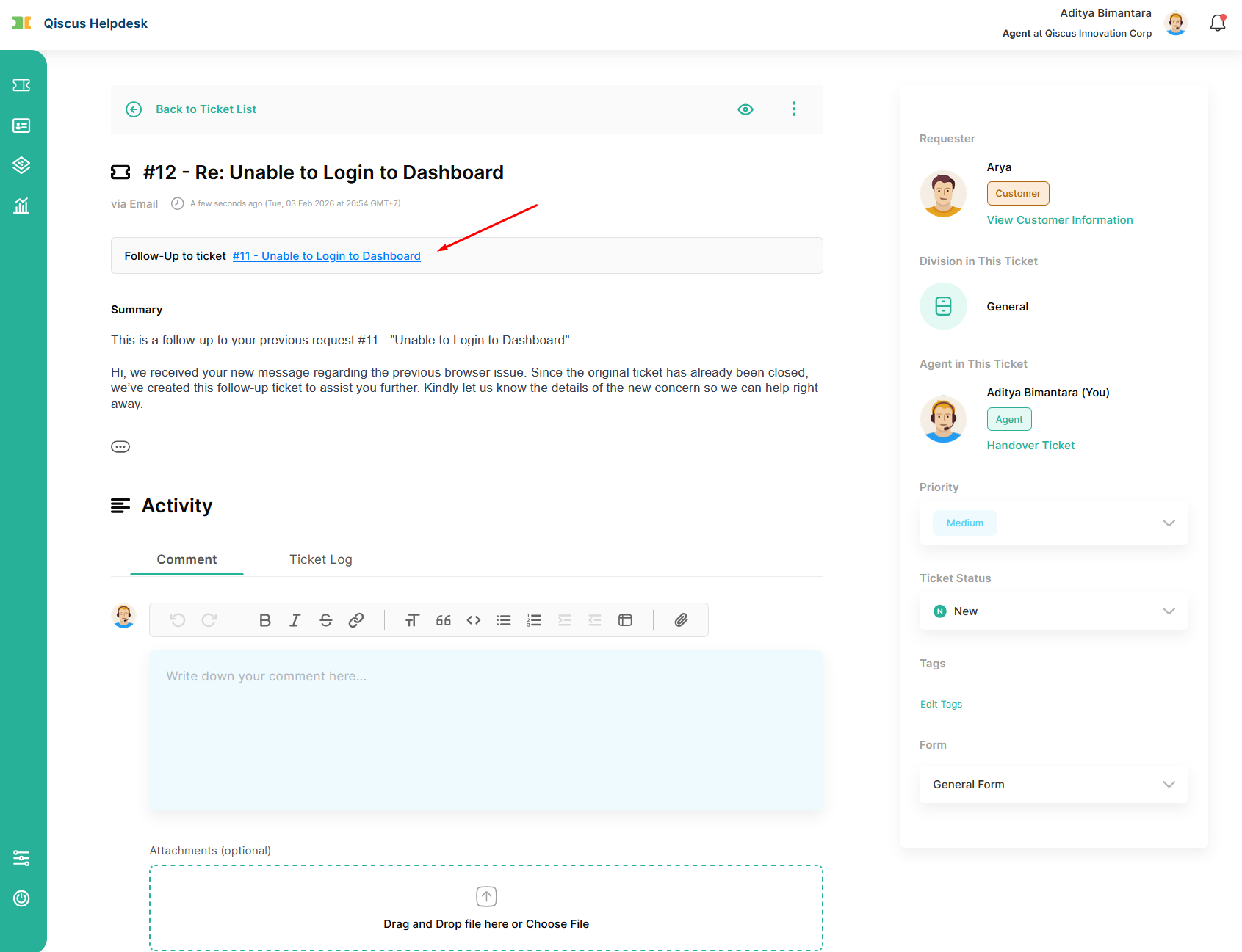 When a ticket is in Closed status, any further conversation is handled through a follow-up ticket. This ensures new requests are tracked separately while keeping the original ticket intact.