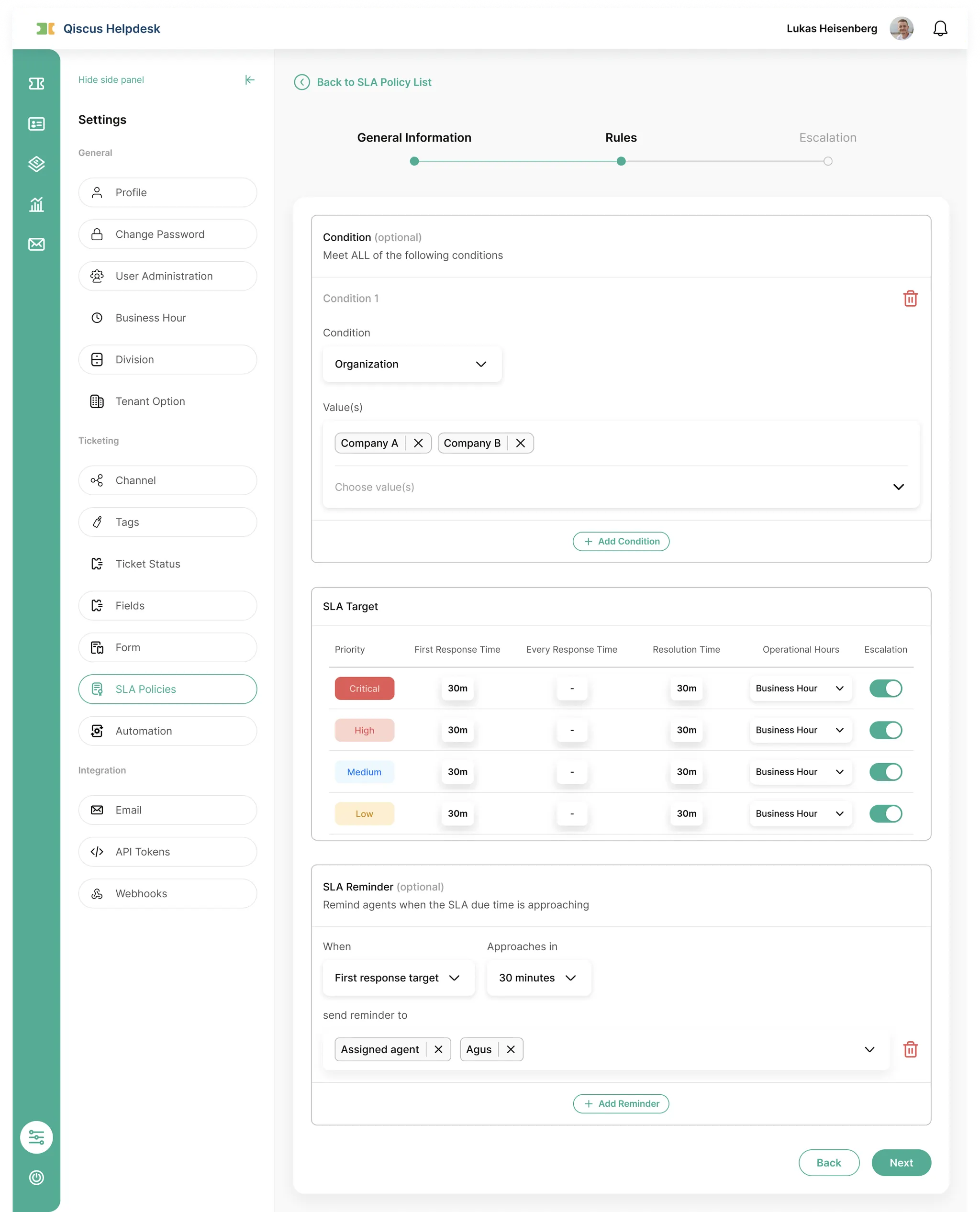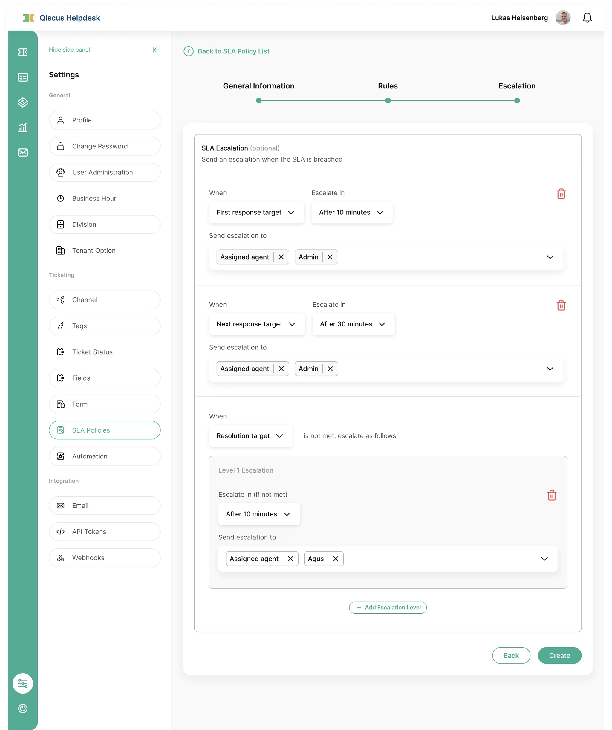 Qiscus Helpdesk provides a guided three-step wizard to create an SLA Policy. This wizard helps you define when the SLA applies, how the SLA targets behave, and how reminders and escalations trigger.