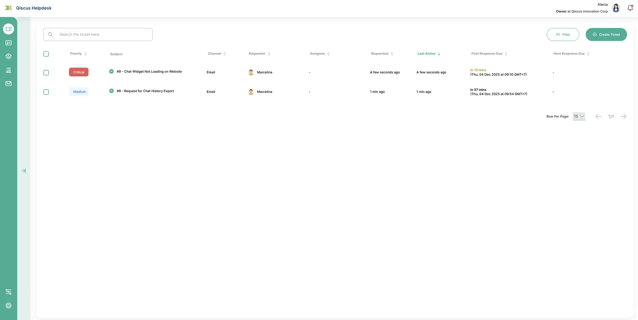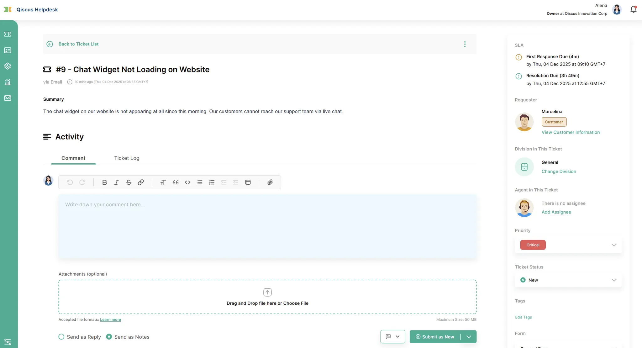 Once an SLA Policy is active, Qiscus Helpdesk will automatically track response and resolution targets across the Ticket List page, Ticket Detail page, notifications, and logs. Agents can immediately see which tickets need attention through SLA due indicators, which help them prioritize their work more effectively.