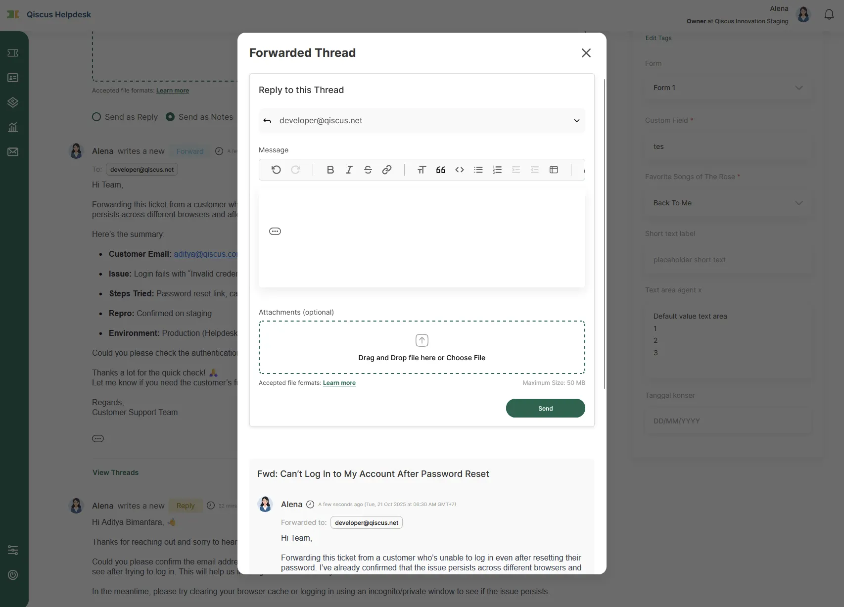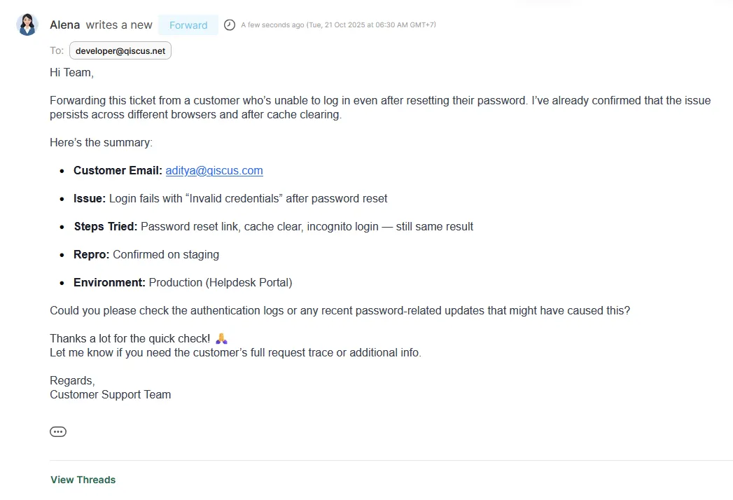After the forward is sent, replies from the recipients will appear in a new thread that’s created automatically for the forward. This keeps the main ticket discussion clean and separates the forwarded conversation for easier tracking.