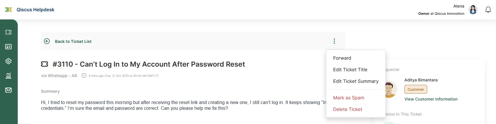 The Ticket Forward feature in Qiscus Helpdesk allows internal users (Agent, Supervisor, Admin, or Owner) to forward a ticket to another recipient or team. This ensures that the right team member or department handles the ticket, improving collaboration and efficiency in resolving issues.
