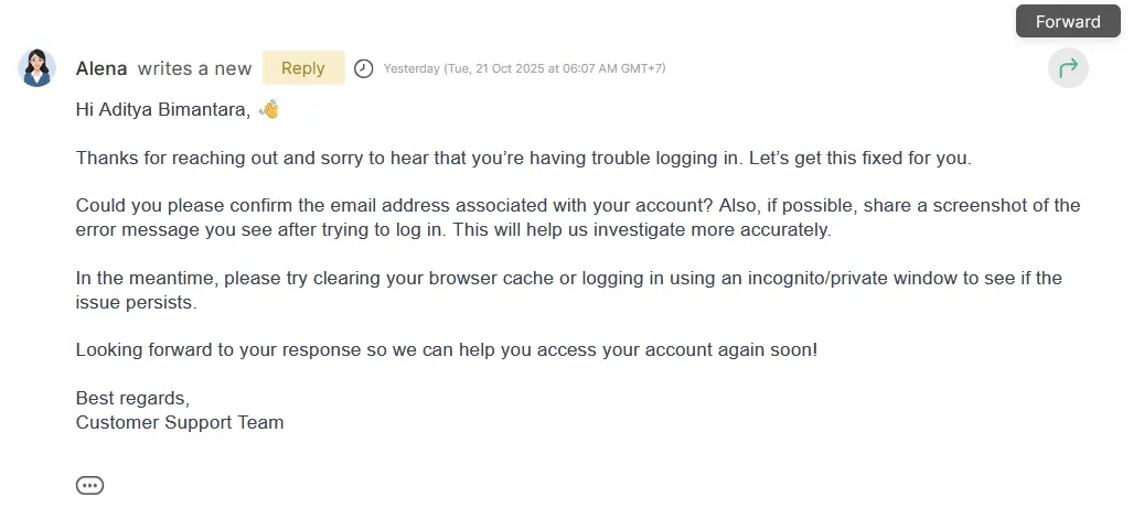 - External Collaboration: Forward tickets to customer-side stakeholders for transparency or updates.