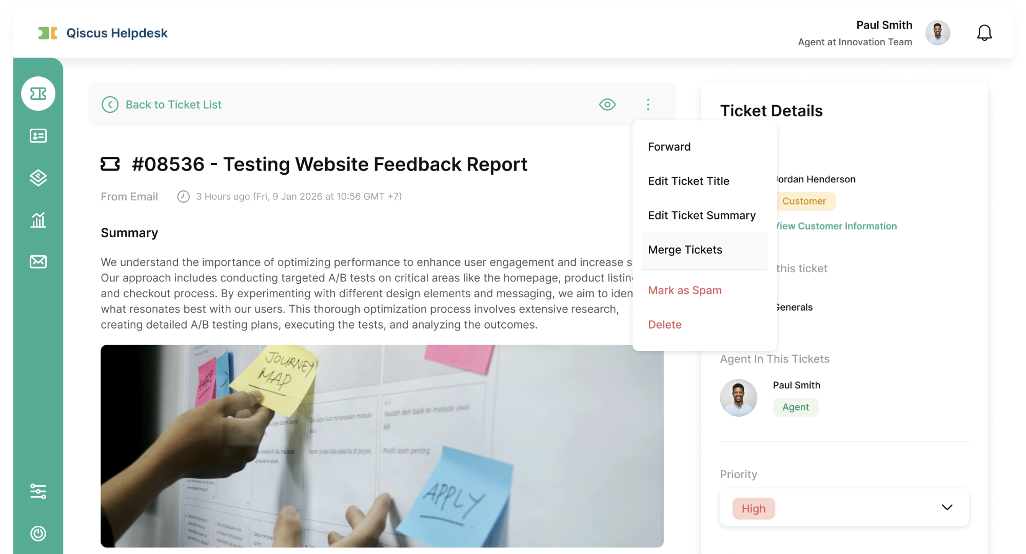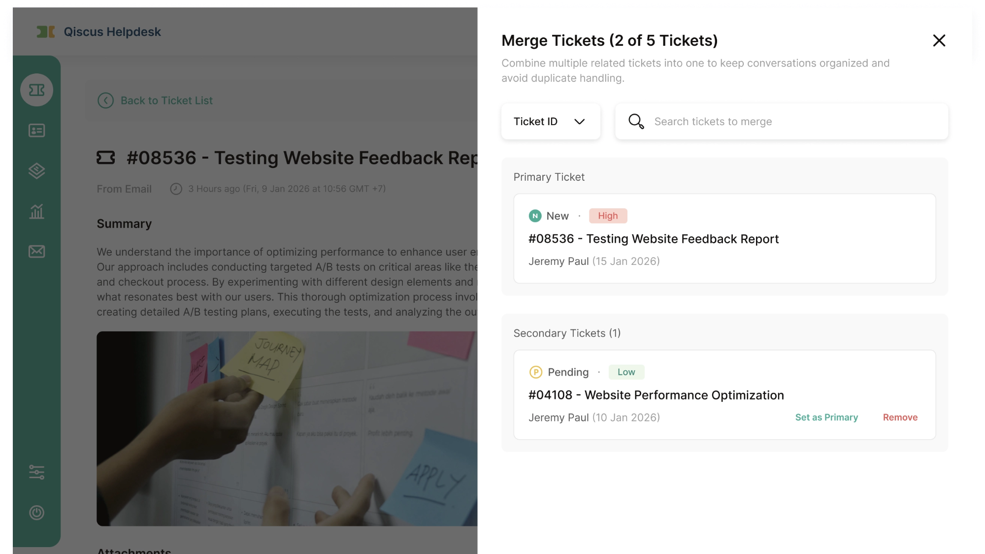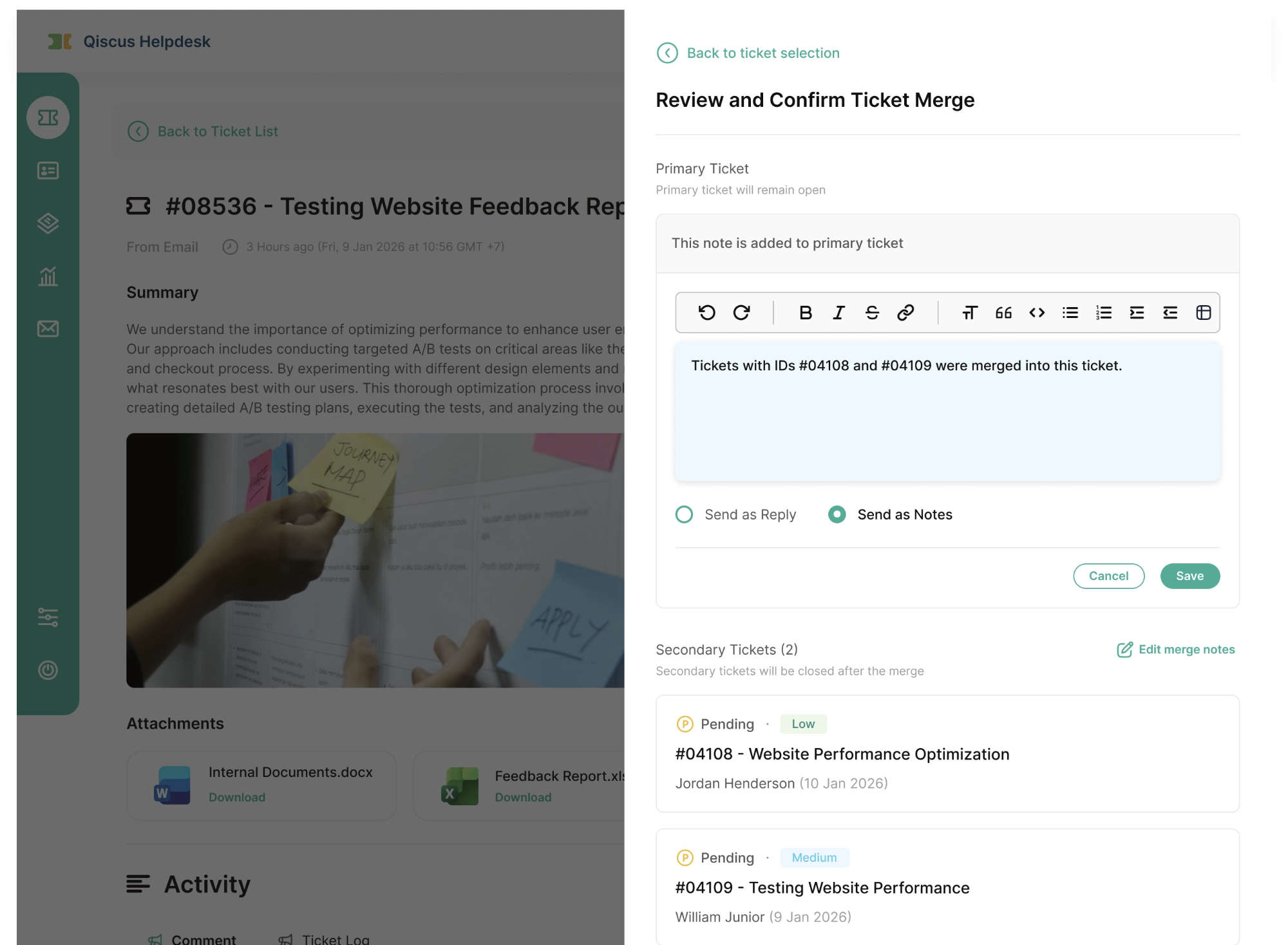 - Close merged tickets automatically Secondary tickets are closed and clearly marked as merged.