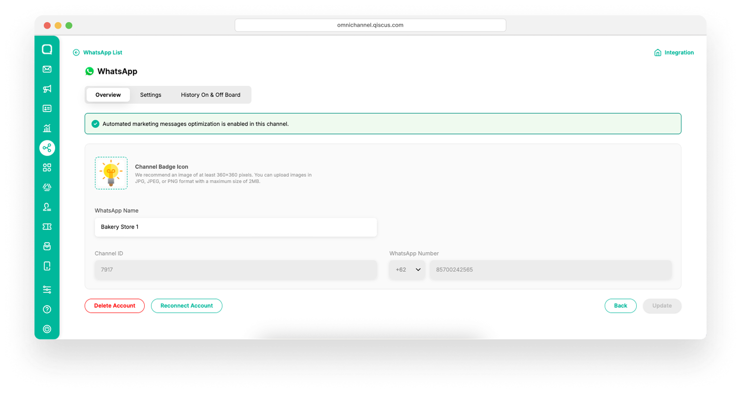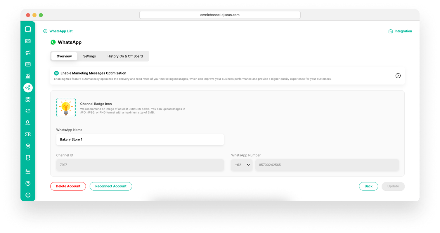 - Click on the History On & Off-board tab to view the status and the last update of the WhatsApp integration.