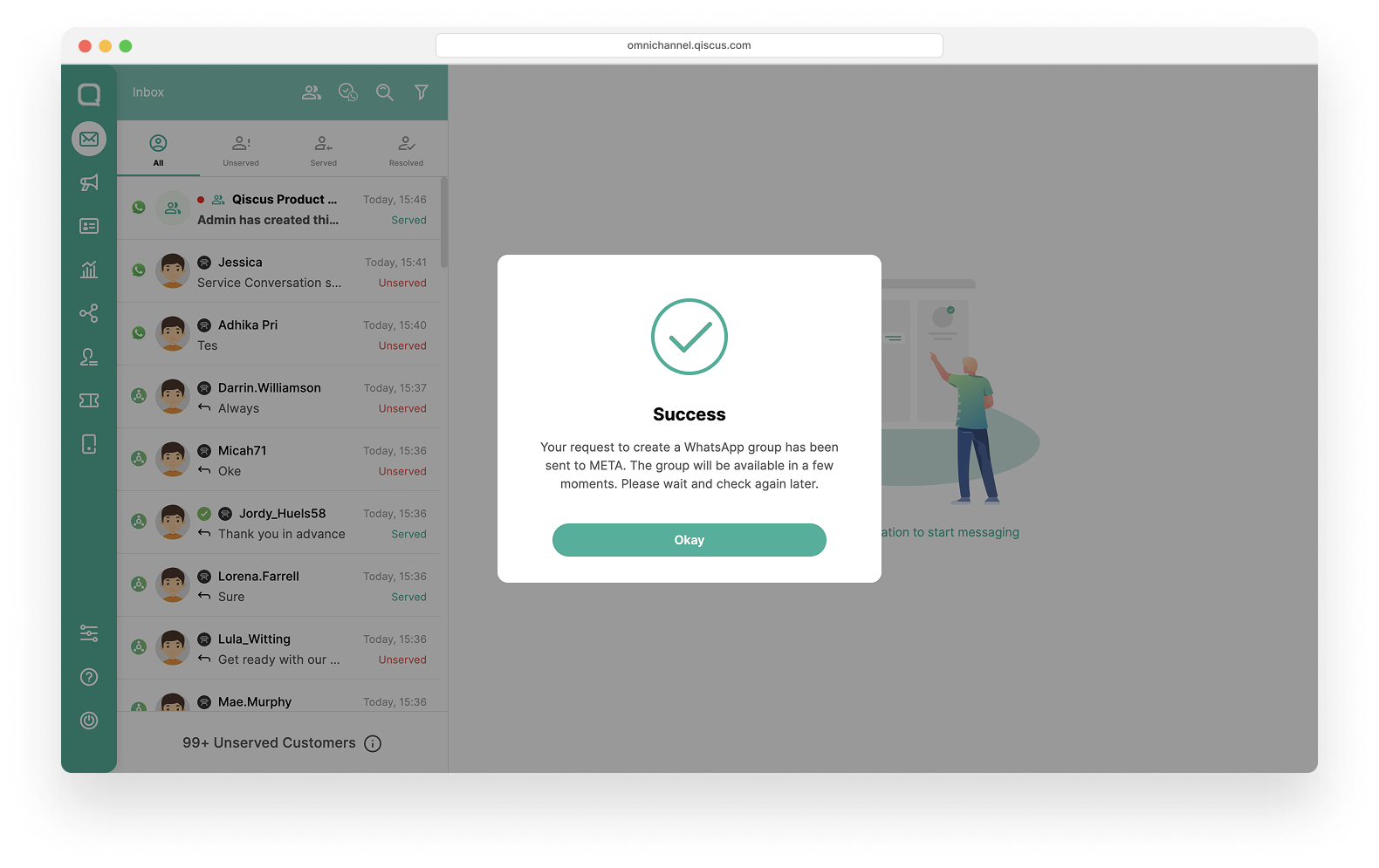 - Maximum Number of Participants: WhatsApp groups in Qiscus Omnichannel Chat can currently accommodate only 8 customers.