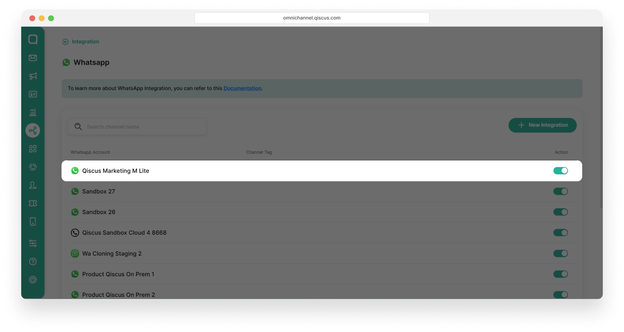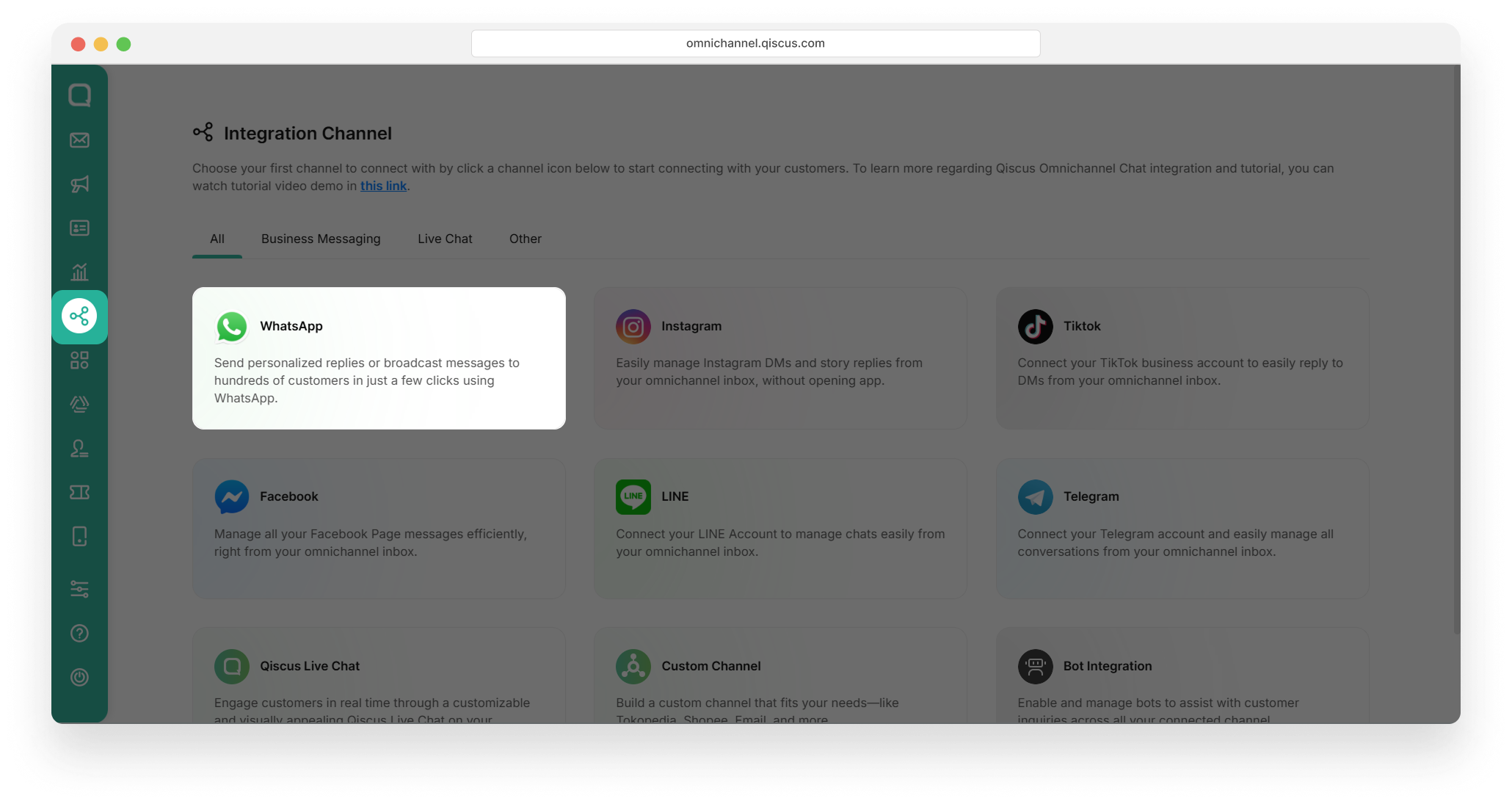 Marketing Broadcast Optimization requires a connected WhatsApp Business account to Qiscus Omnichannel Chat. This integration is essential to access the tools and features. You can integrate your WhatsApp account in the following ways: