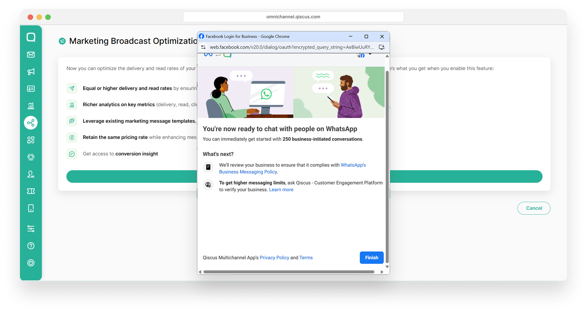 - Complete the Facebook Request Access process, which involves providing business details, WhatsApp Business profile, and verification. Click Finish once completed.