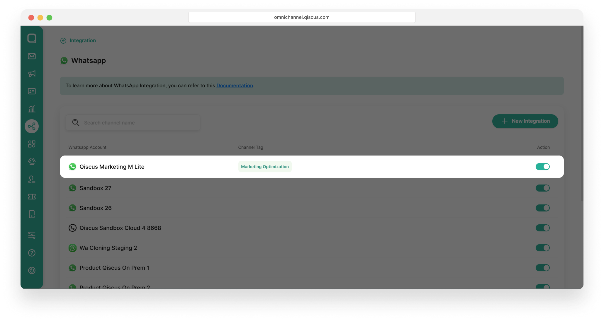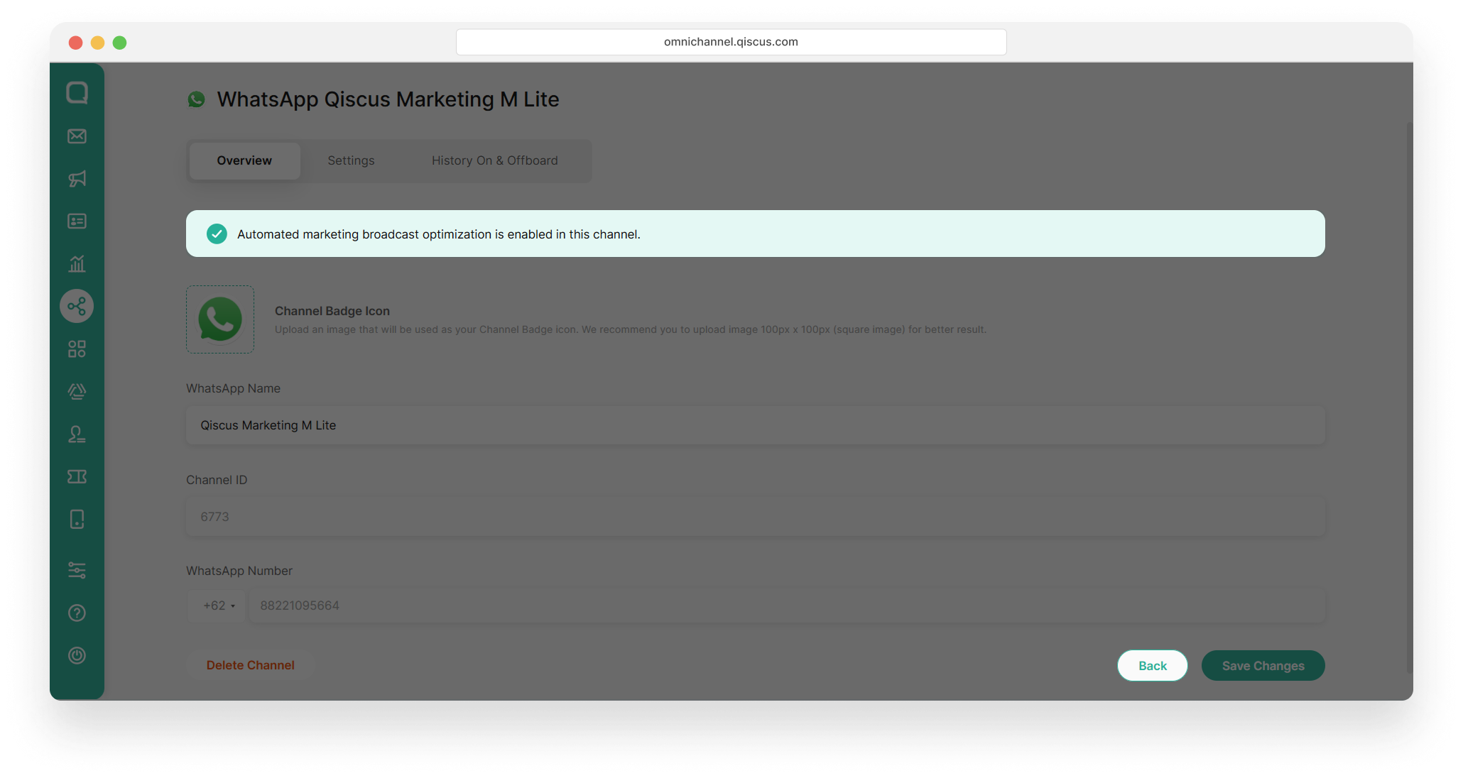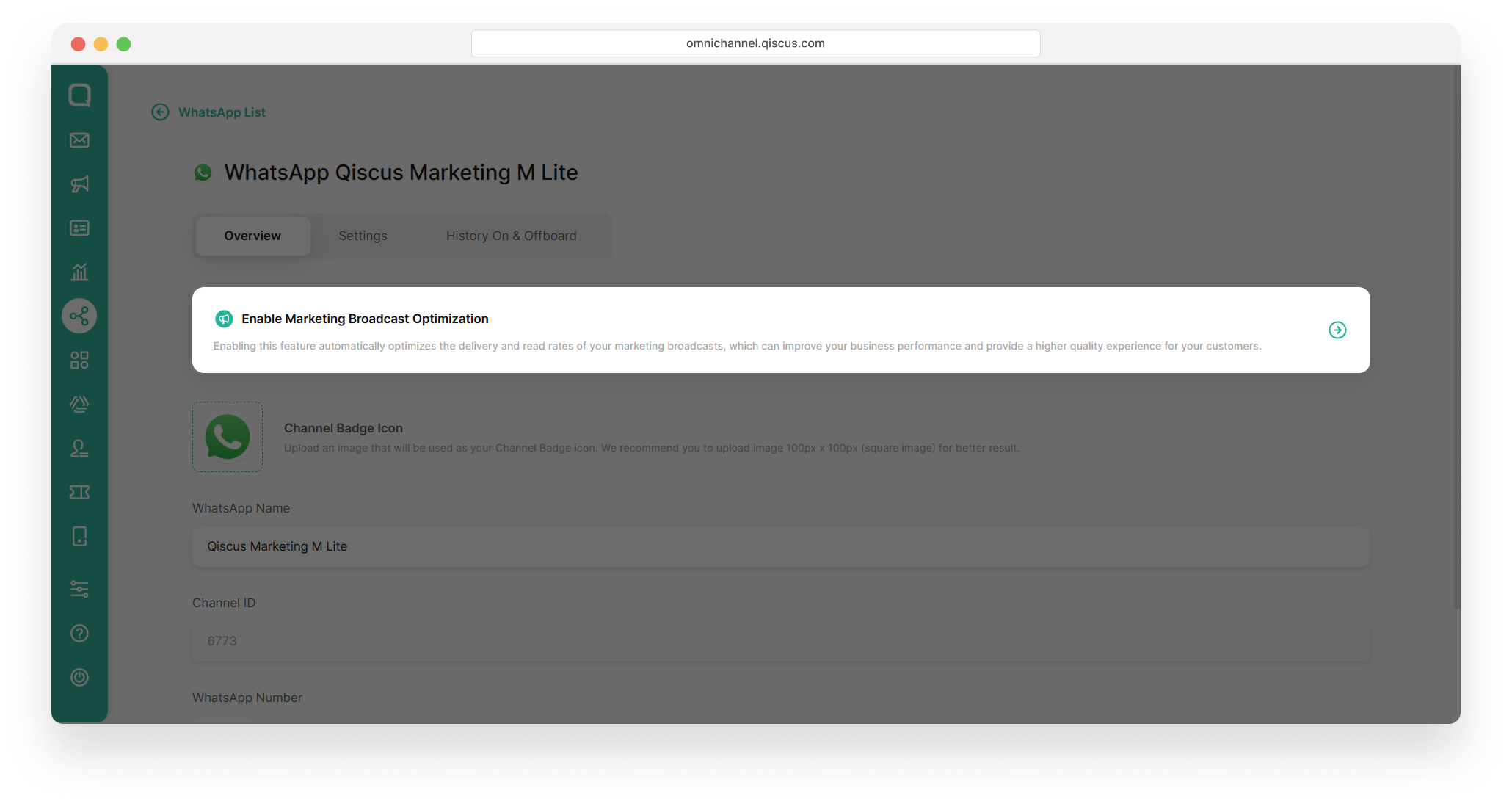 - You will see the "Marketing Optimization" label in the WhatsApp Channel Integration, indicating that this WhatsApp account has Marketing Broadcast Optimization enabled.