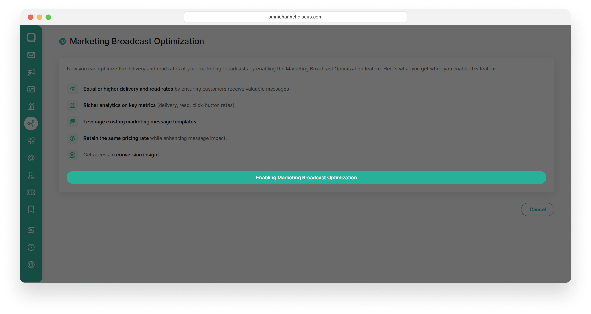 - Review the feature benefits on the Marketing Broadcast Optimization page and proceed by clicking Enable Marketing Broadcast Optimization.