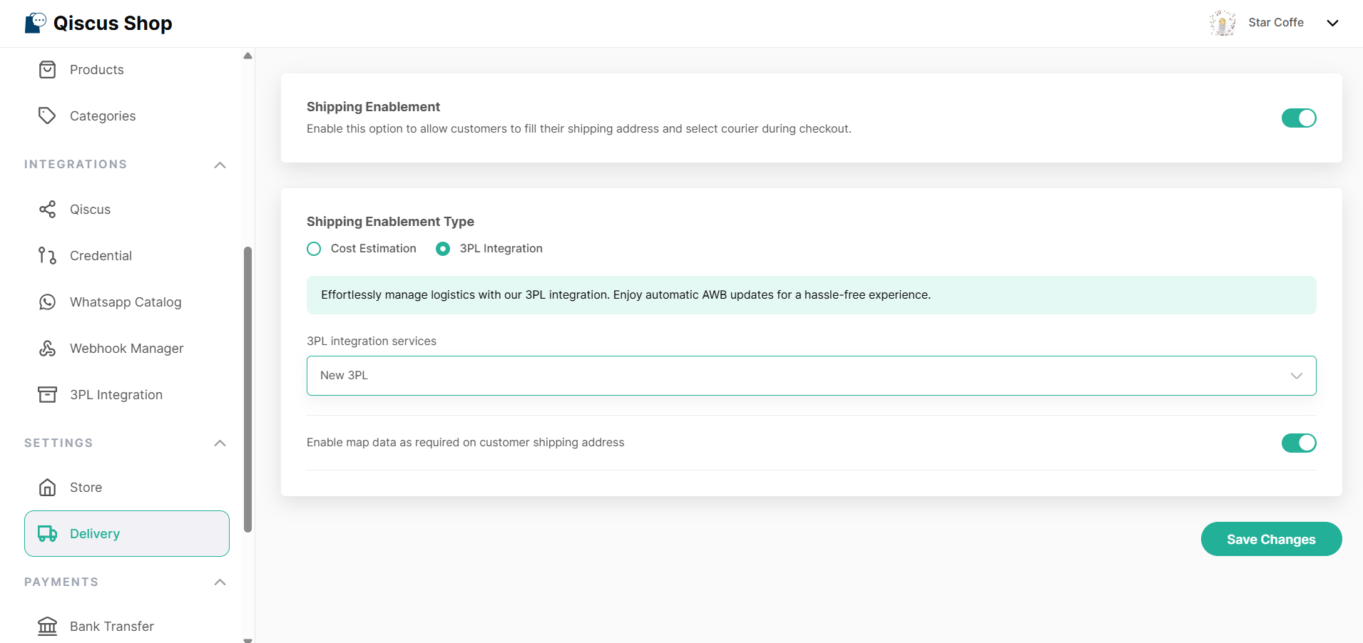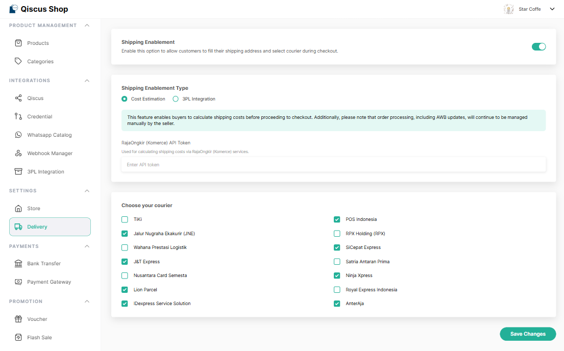 Qiscus Shop offers delivery services, allowing you to facilitate the delivery process from your store's warehouse to the customer's address. To activate this feature, simply toggle the option in the shipping enablement section. Once enabled, you'll need to select between two options: cost estimation or 3PL integration.