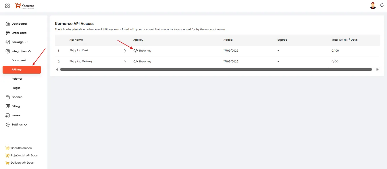 To enable this option, you also need to provide your RajaOngkir (Komerce) API Token. Make sure you already have a Komerce account, then obtain the token from the Komerce Dashboard under API Key → Shipping Cost. Copy the token, paste it into the RajaOngkir (Komerce) API Token field in Qiscus Shop, and click Save. Once saved, your cost estimation is ready to use.